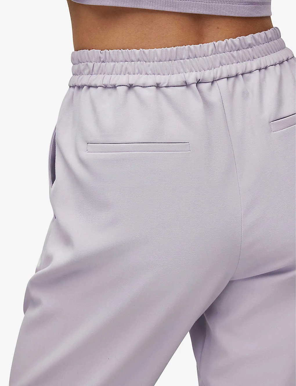 - Mid-rise, tapered fit, two slip pcokets at sides, finished hemlines, tonal stitching