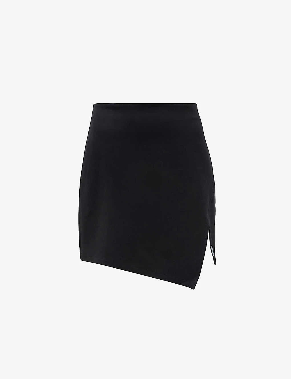 - Mid-rise, faux wrap-around style, slit at the hem, asymmetric hemline