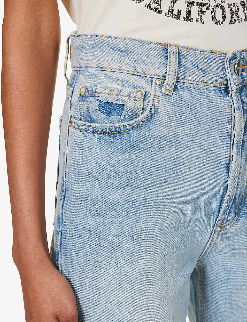 - Relaxed fit, high rise, straight leg, structured waistband with belt loops, five pockets, curved yoke at back, brand patch at back, faded wash, contrast stitching, distressed trims and patches, branded silver-toned hardware