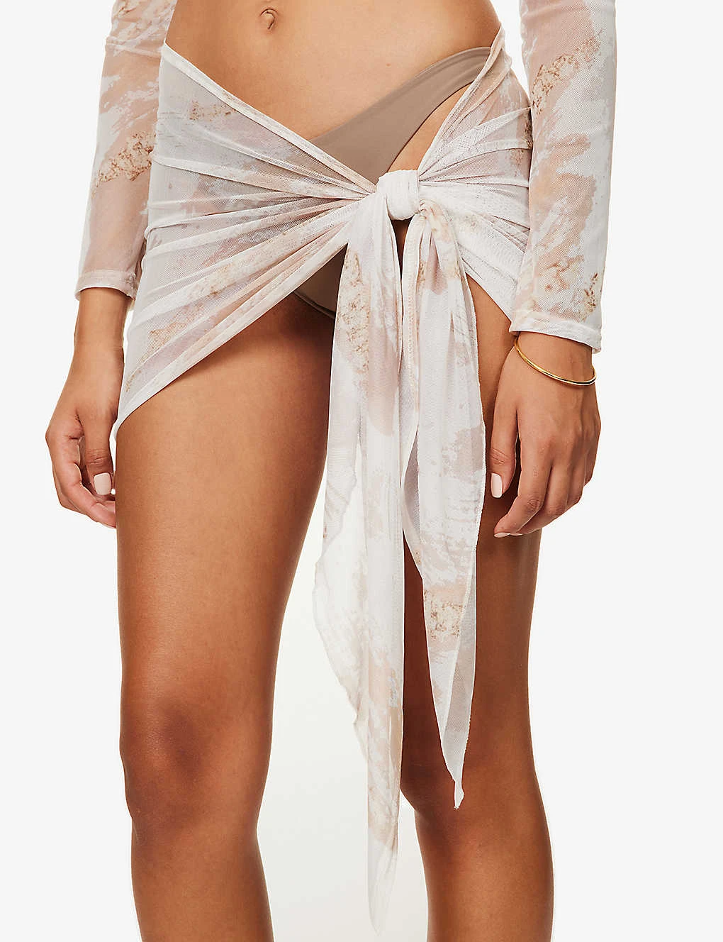 - Asymmetric shape, all over abstract print, all over mesh pattern