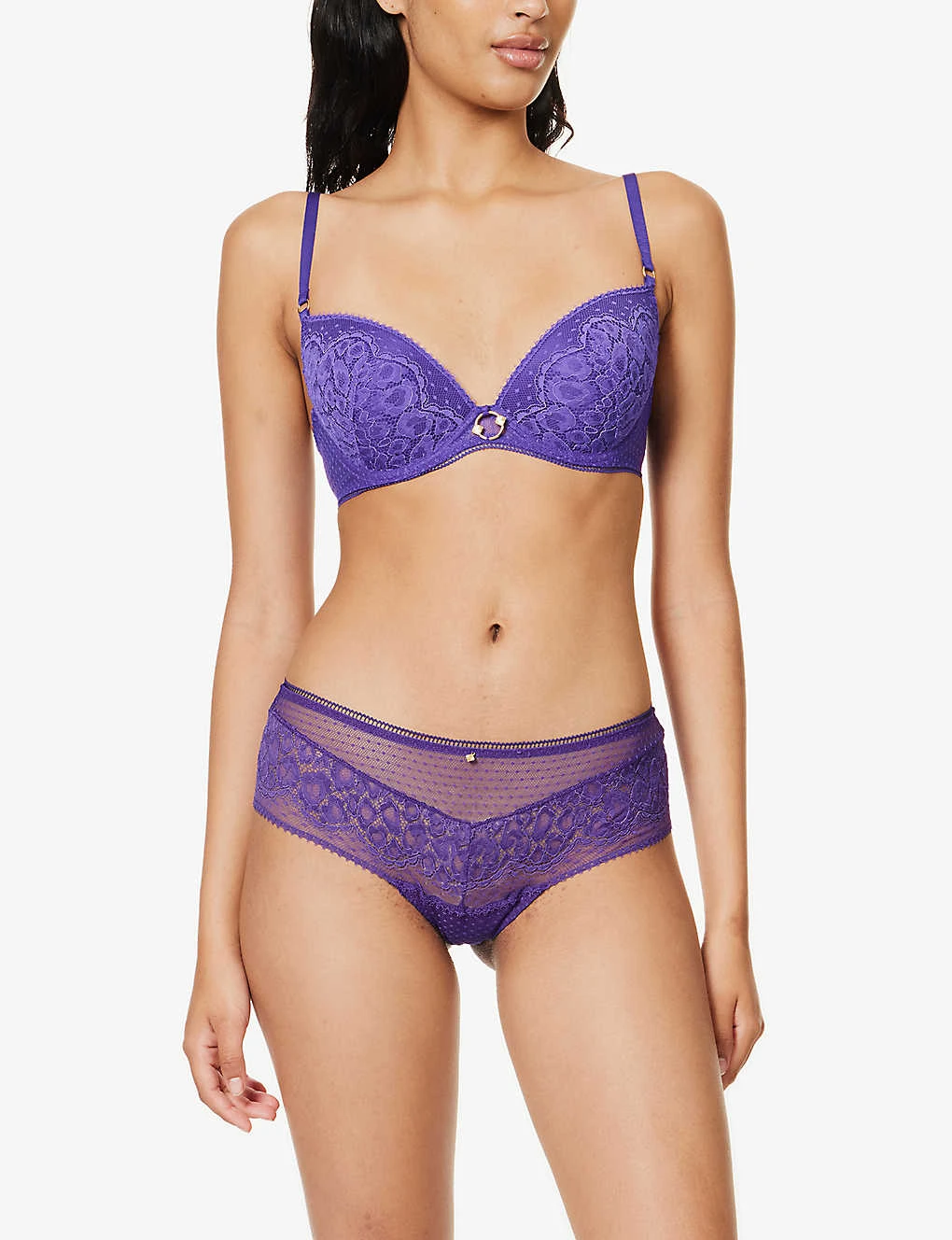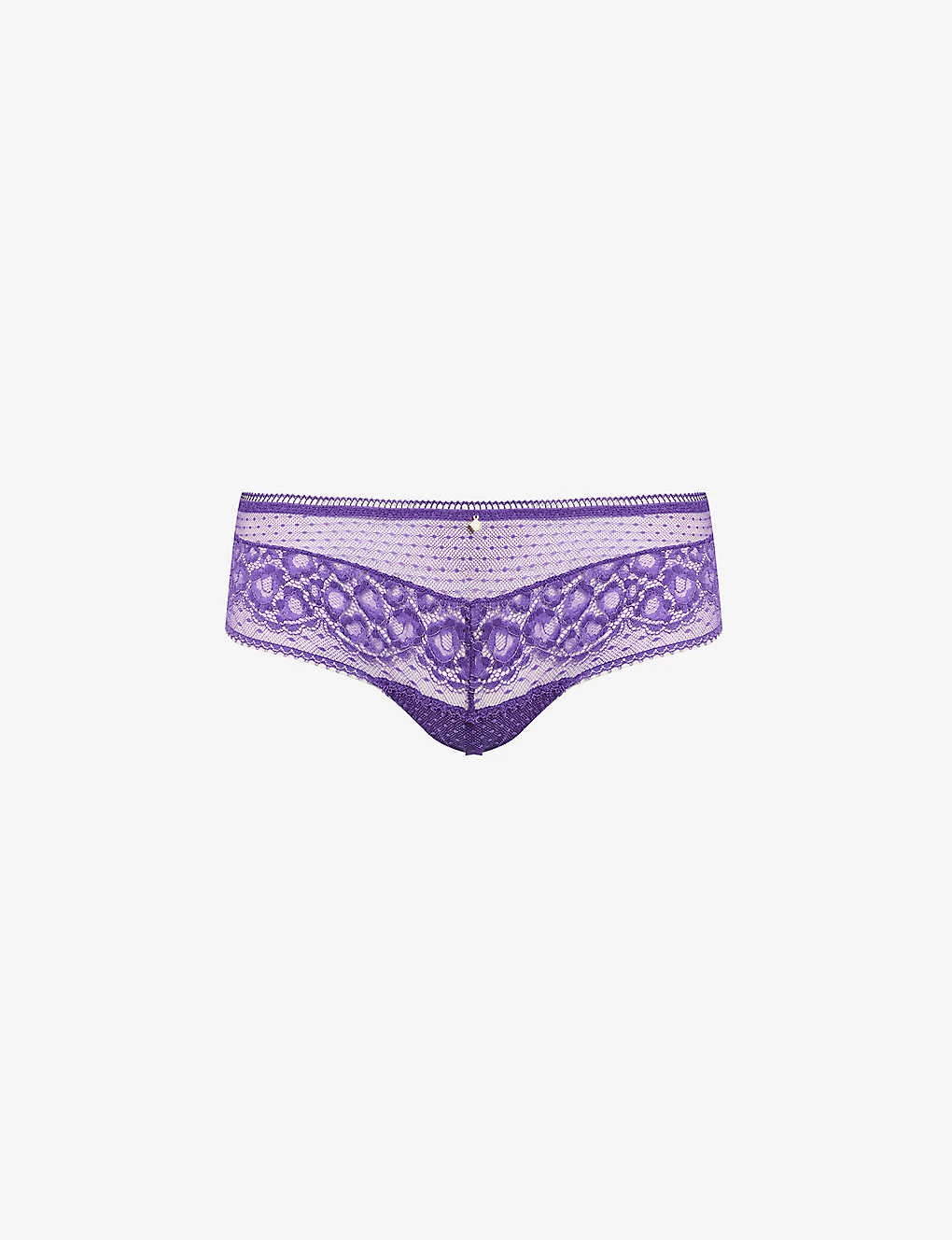 - Mid-rise, elasticated waistband, gold-toned charm at front and back, lace panels, cut-out at back, medium coverage at back, semi-sheer