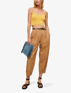 - Slim fit, low rise, deconstructed waistband, abstract knit pattern, metallic thread weave, fine knit