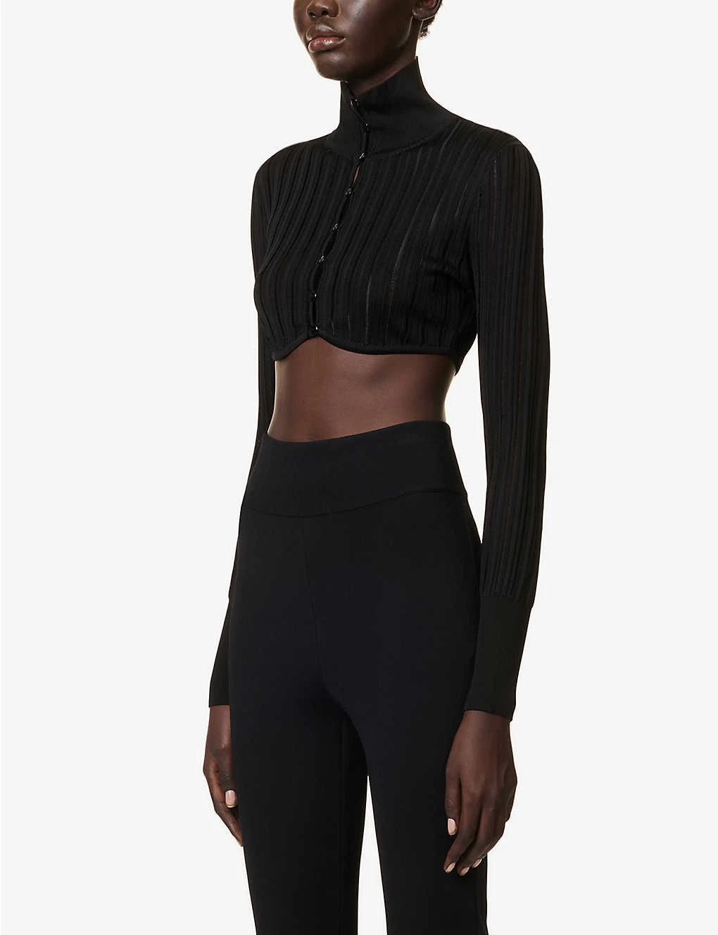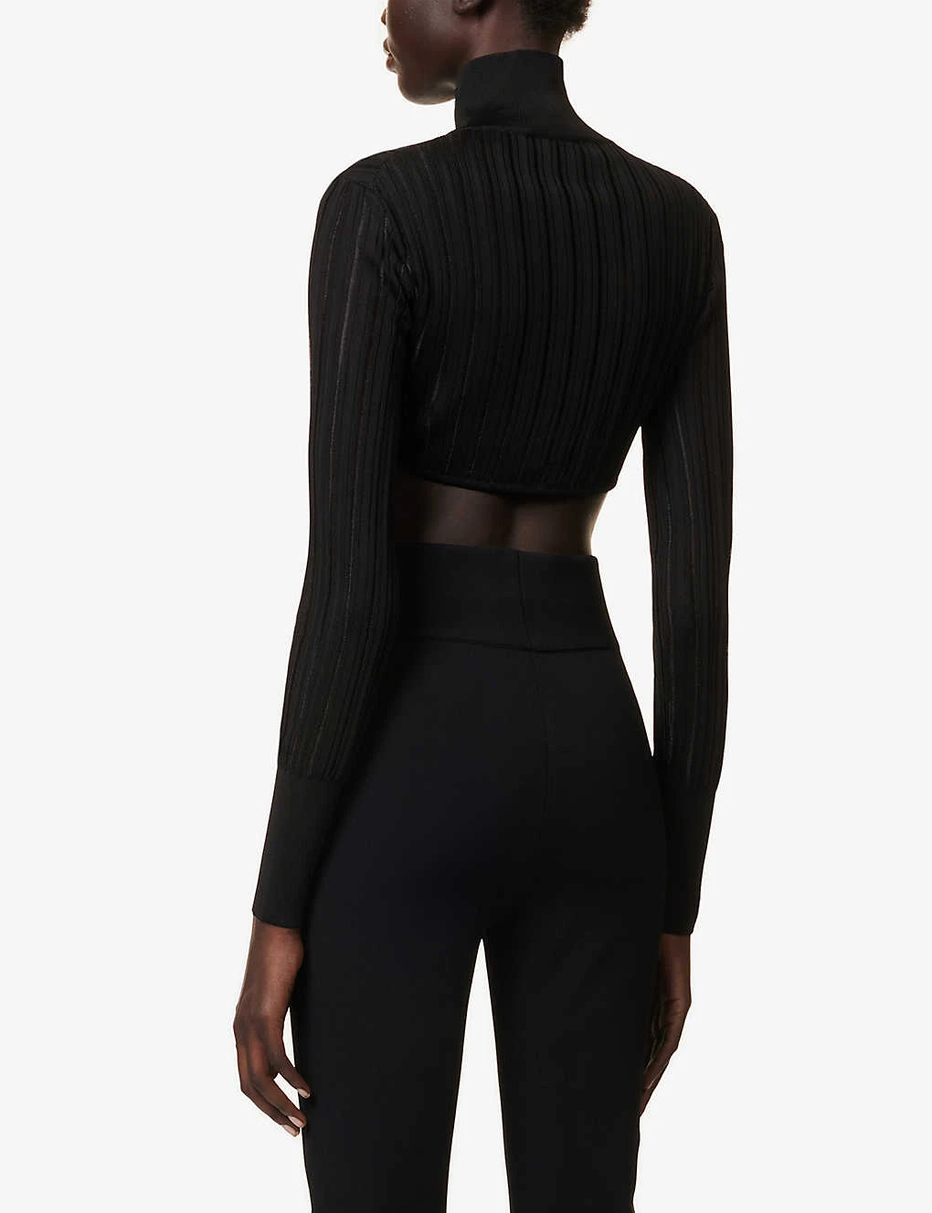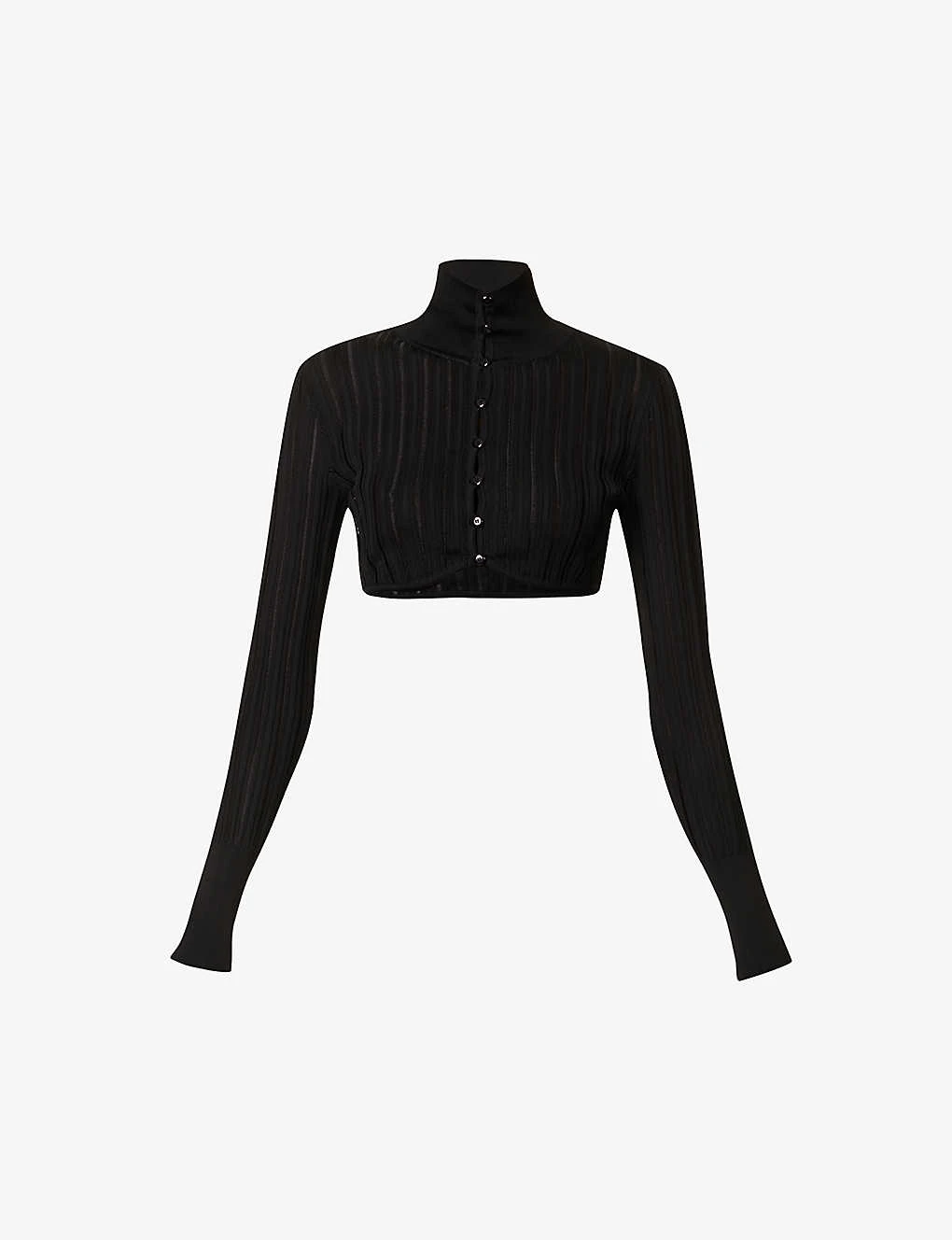 - Slim fit, high neck, long sleeves, semi-sheer, cropped, ribbed trims