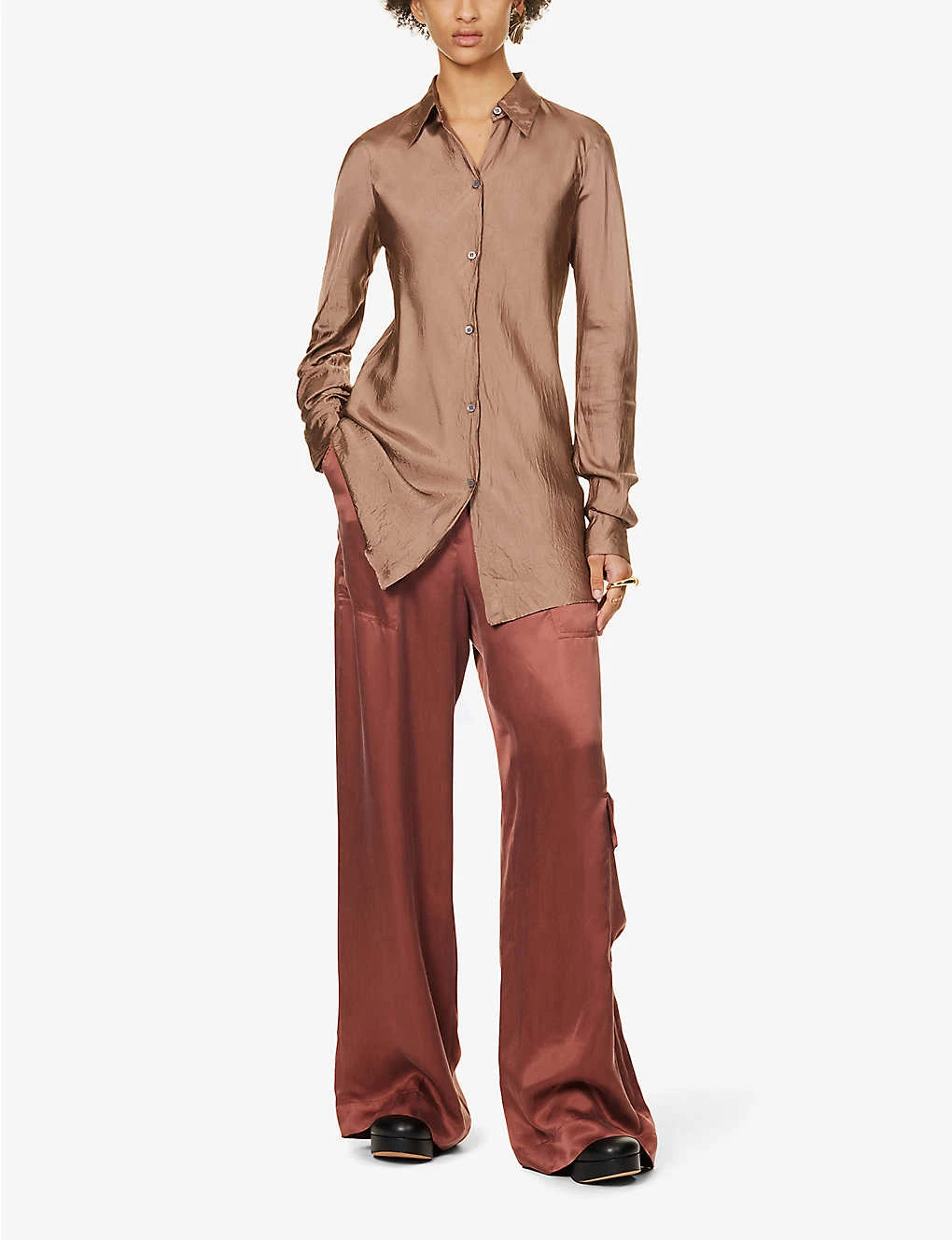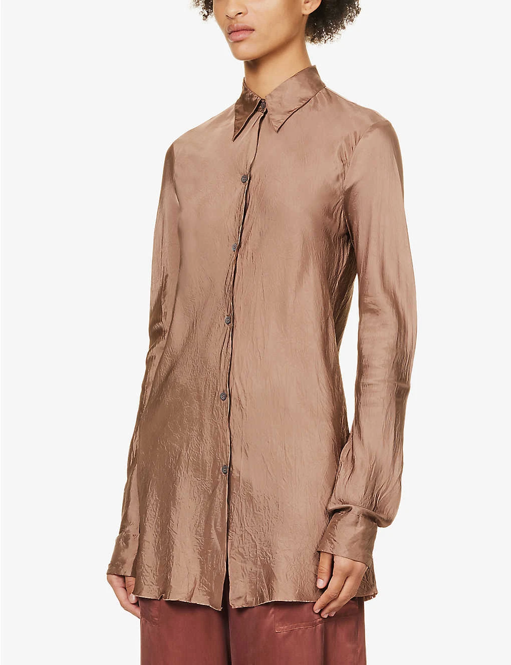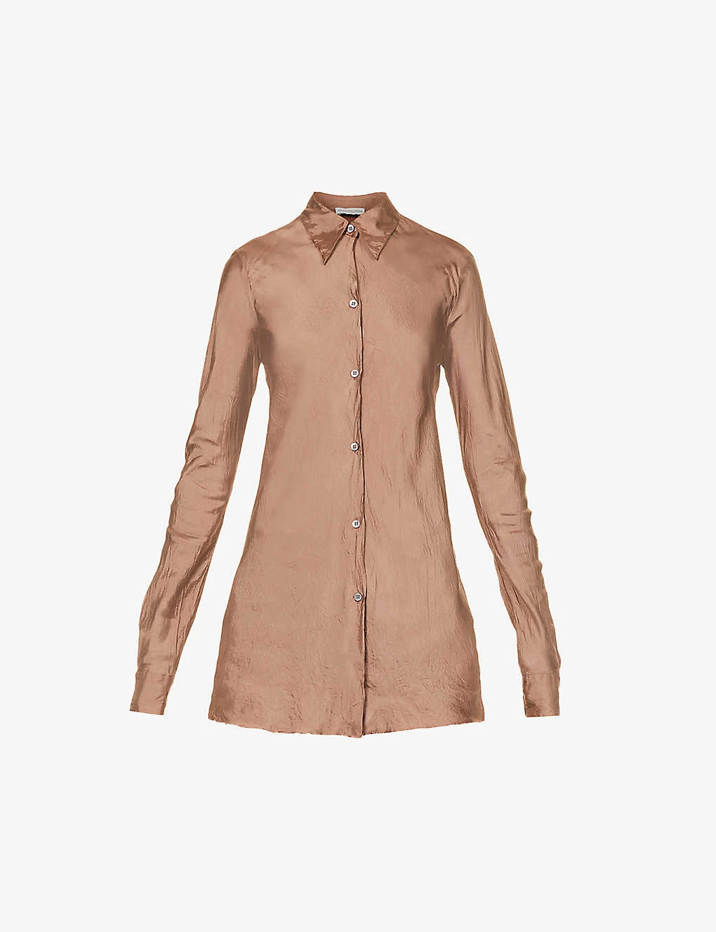 - Slim fit, collar, long sleeves, buttoned sleeve hems, soft crease design, satin texture, pearlescent buttons