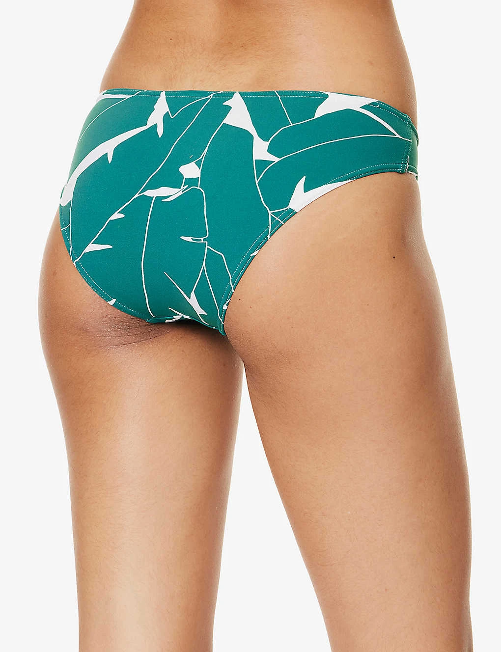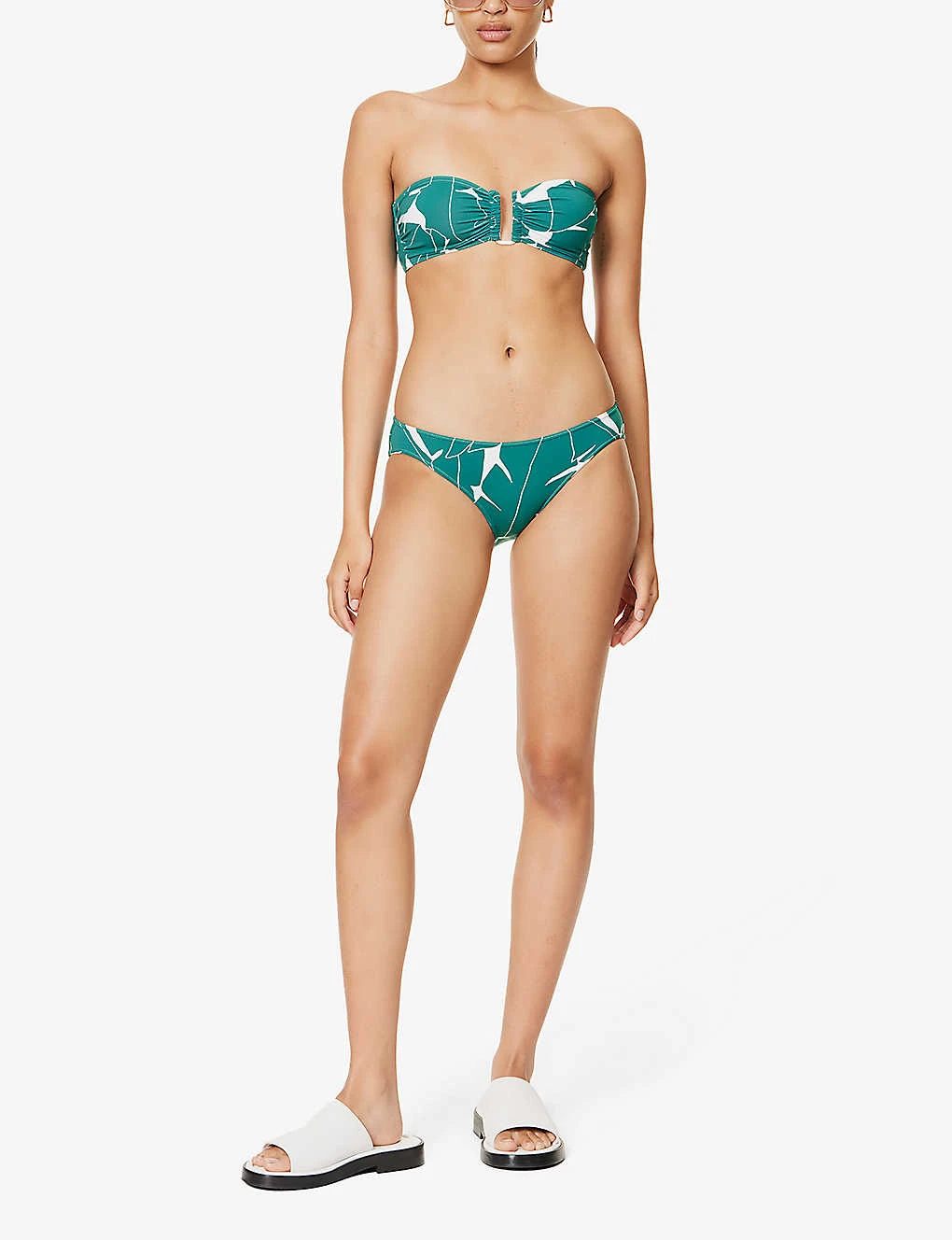 - Sweetheart neckline, U-ring at front, ruching at front, all-over print, branded hardware