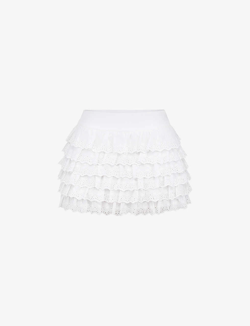- Mid rise, ruffle-trim, broderie-anglaise detail throughout, mini length