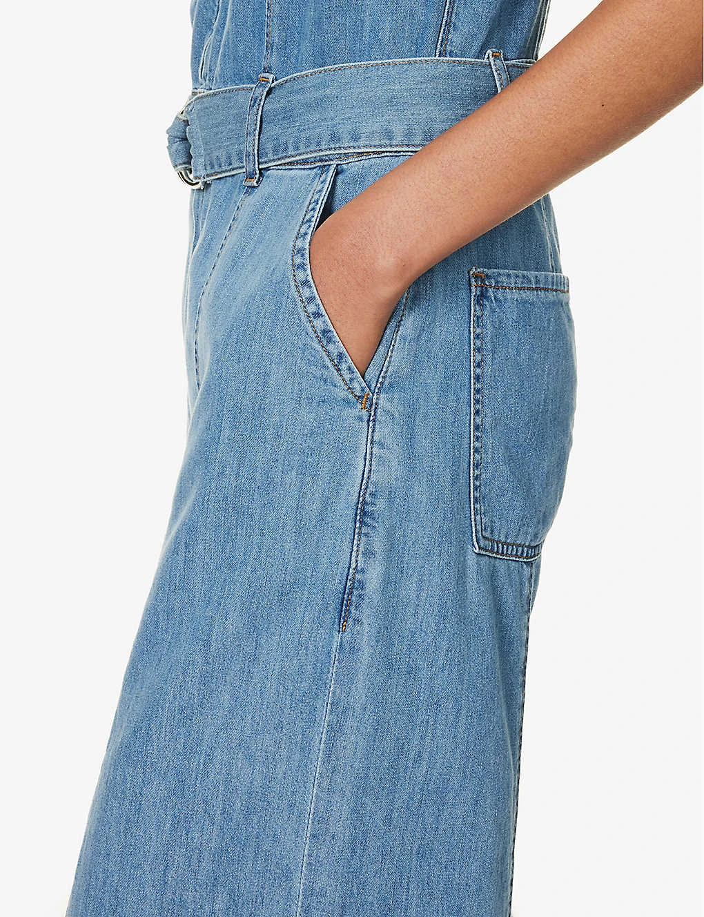 - Regular fit, collar, wide leg, sleeveless, dropped armholes, two patch pockets at chest, two slip pockets at front, belt loops with detachable belt, mid-faded wash, contrast stitching, branded silver-toned hardware