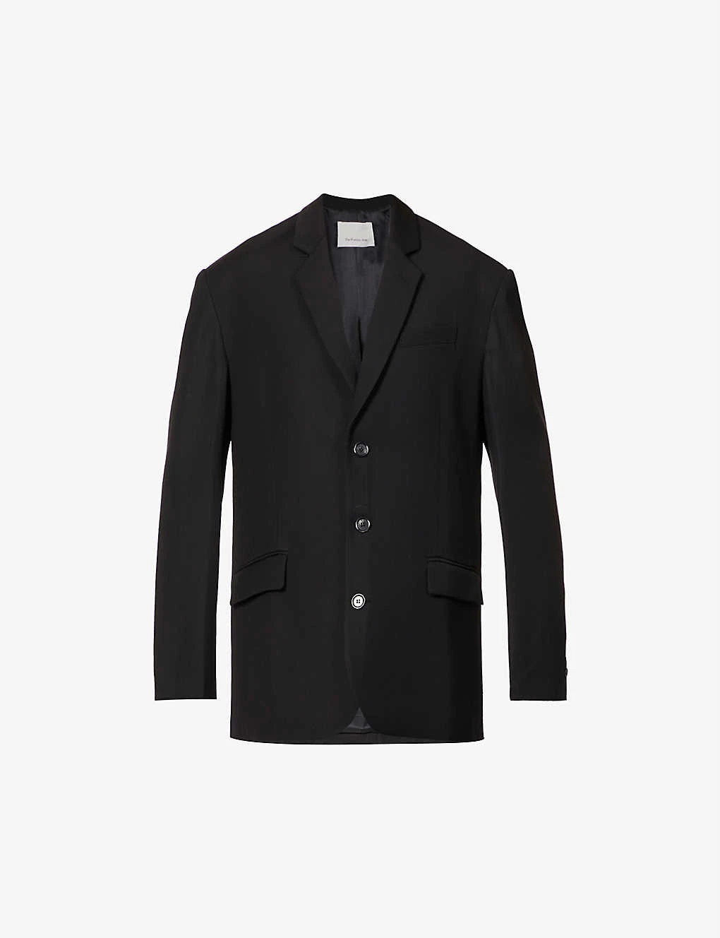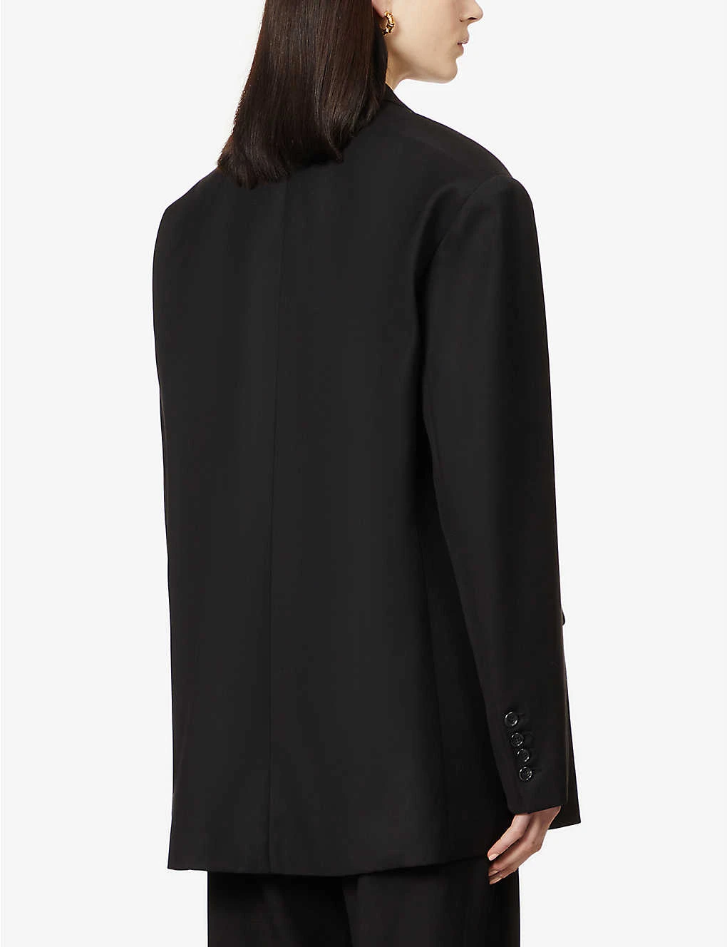- Oversized fit, notch lapels, single breasted, padded shoulders, long sleeves, buttoned cuffs, one welt pocket at chest, two welt pockets at sides, fully lined