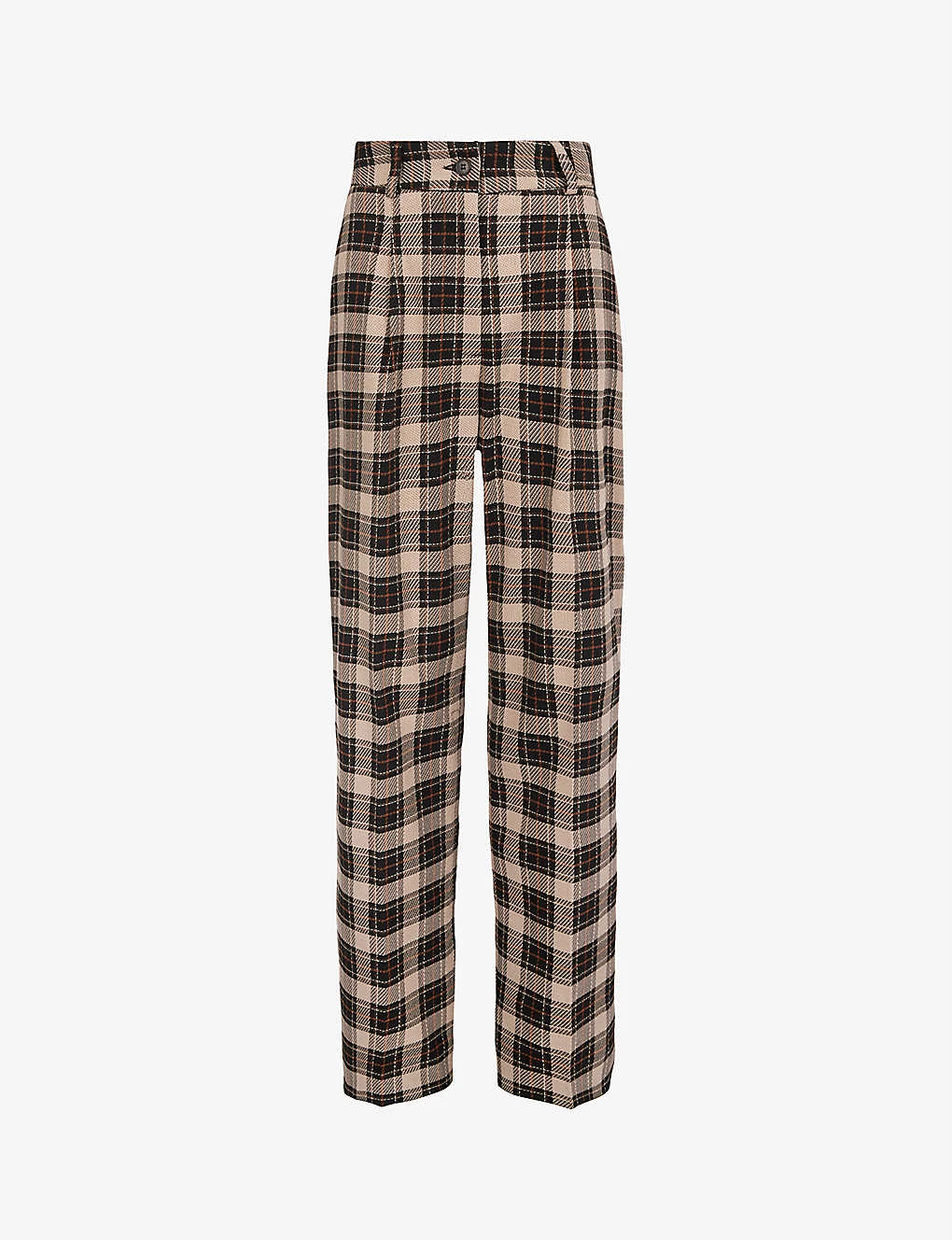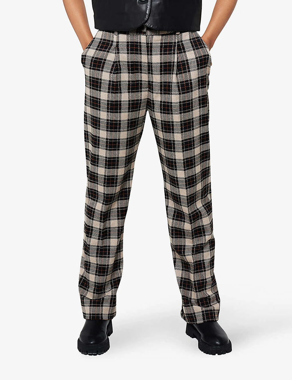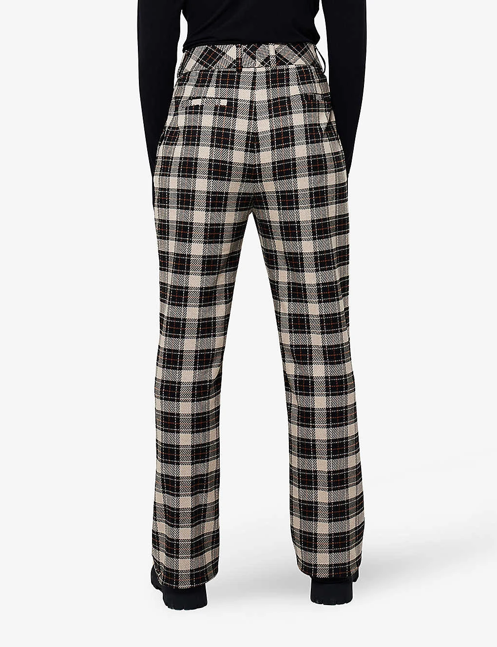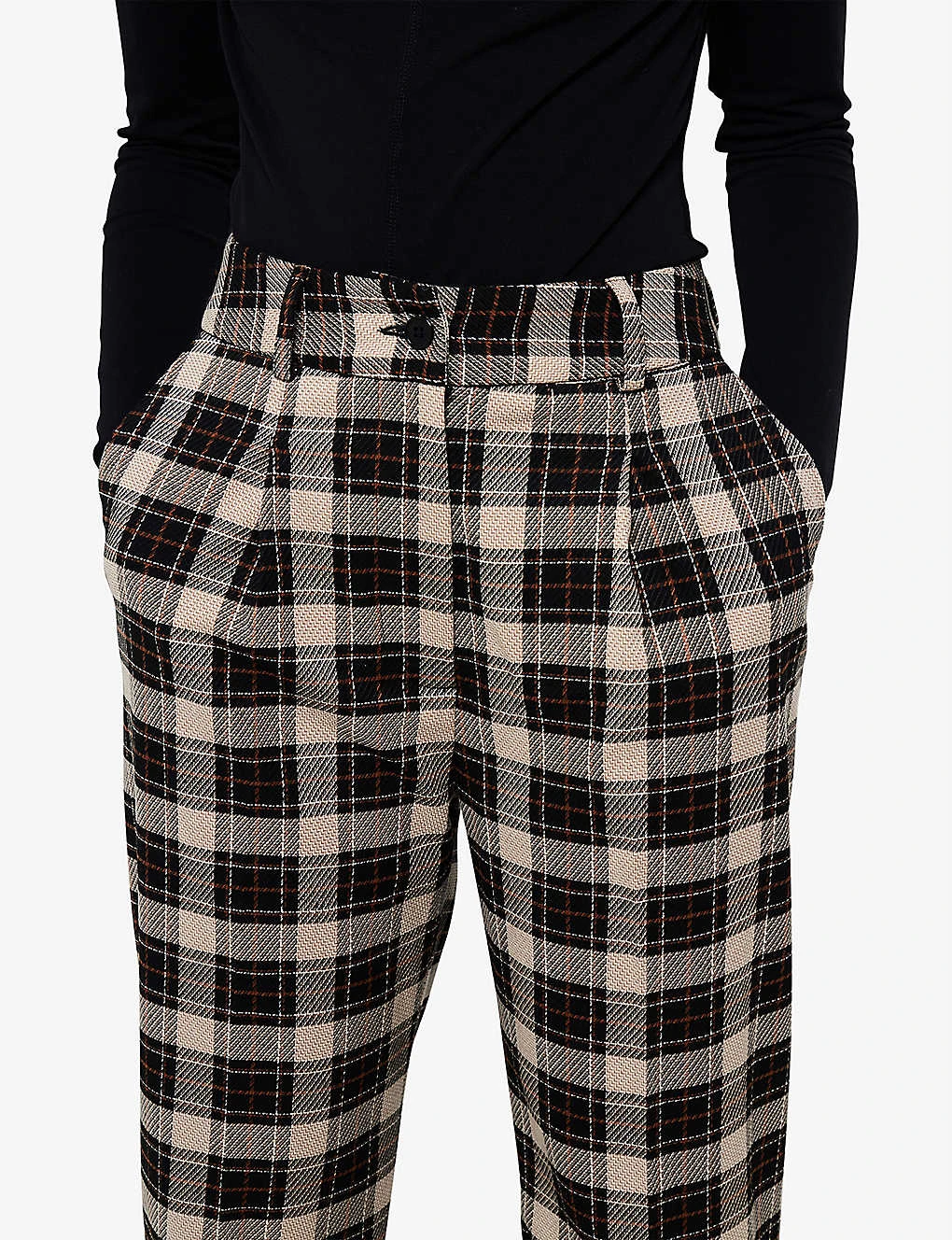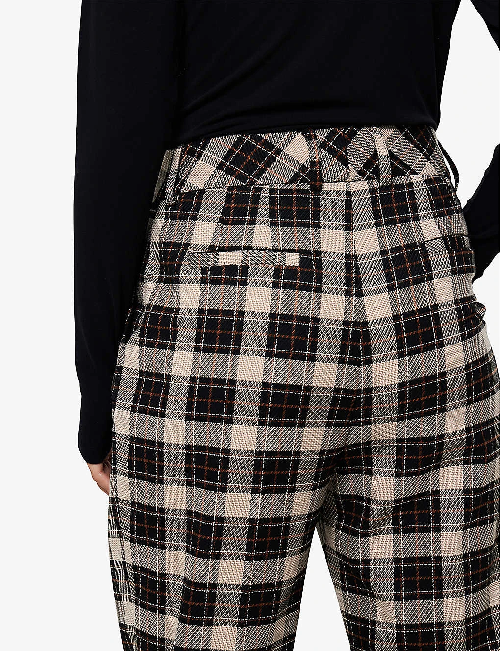 - Regular-fit, mid-rise, straight-leg, structured waistband, check-print, pleats at front, pressed centre crease, two jet pockets at back, cropped