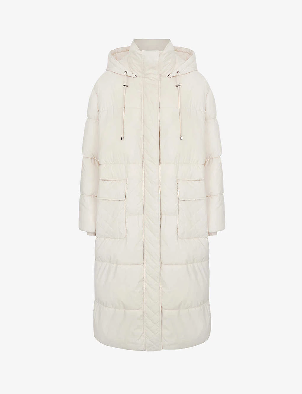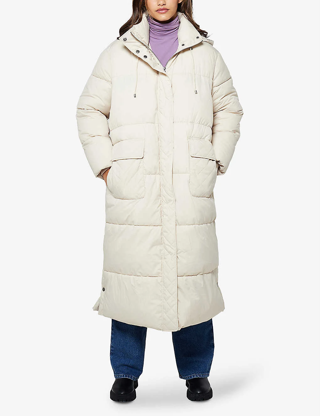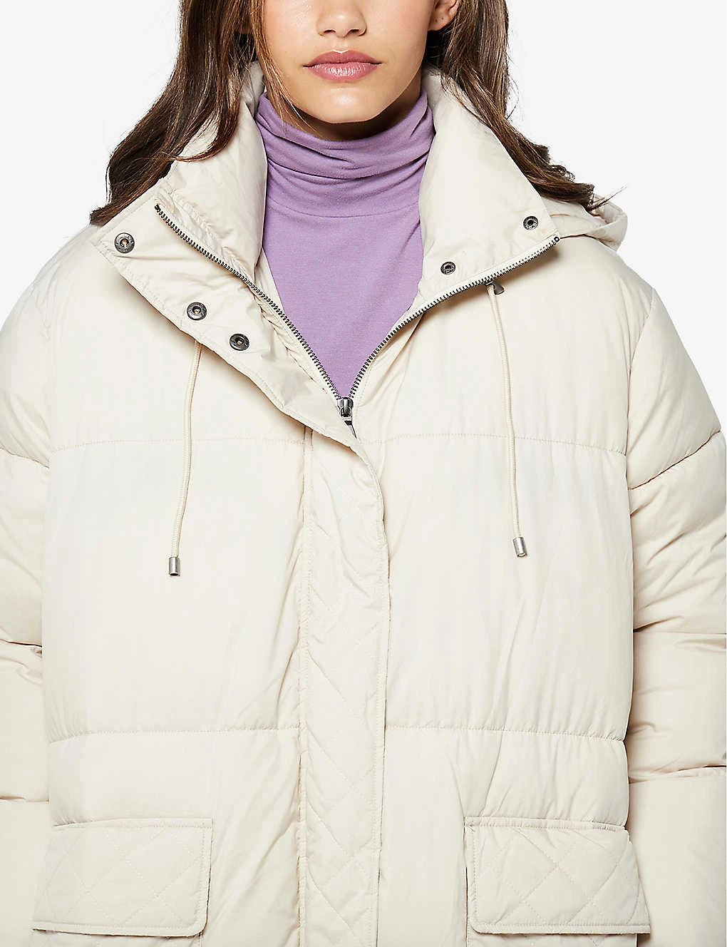 - Oversized fit, drawstring hood, side pockets, all-over quilting
