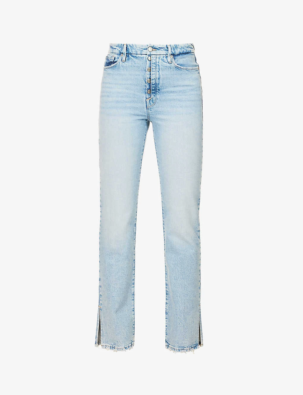 - Regular fit, mid-rise, straight leg, belt loops, five pockets, faded wash, distressed cuffs