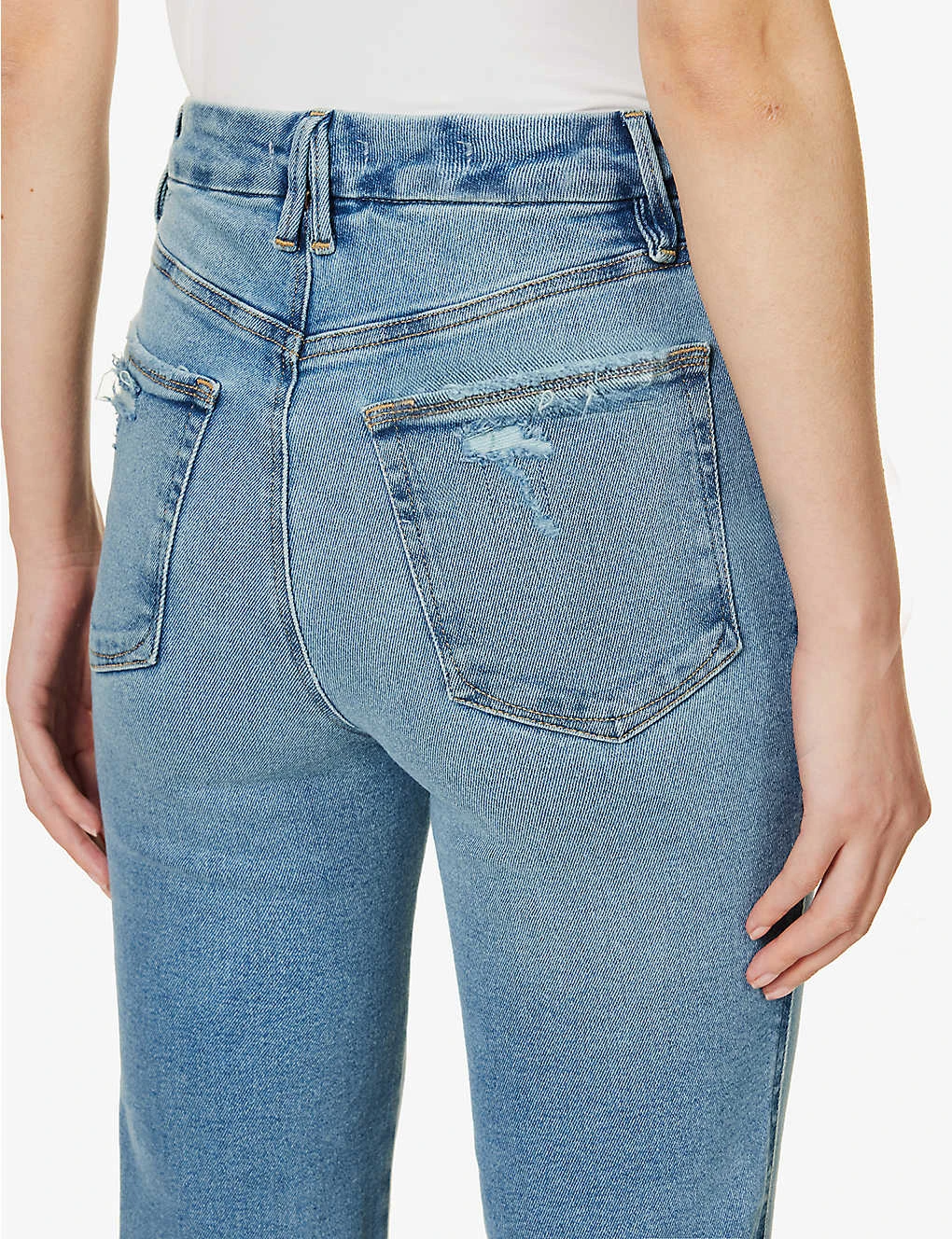- Slim fit, mid-rise, straight leg, belt loops, five pockets, contrast stitching, silver-toned hardware, distressed at back