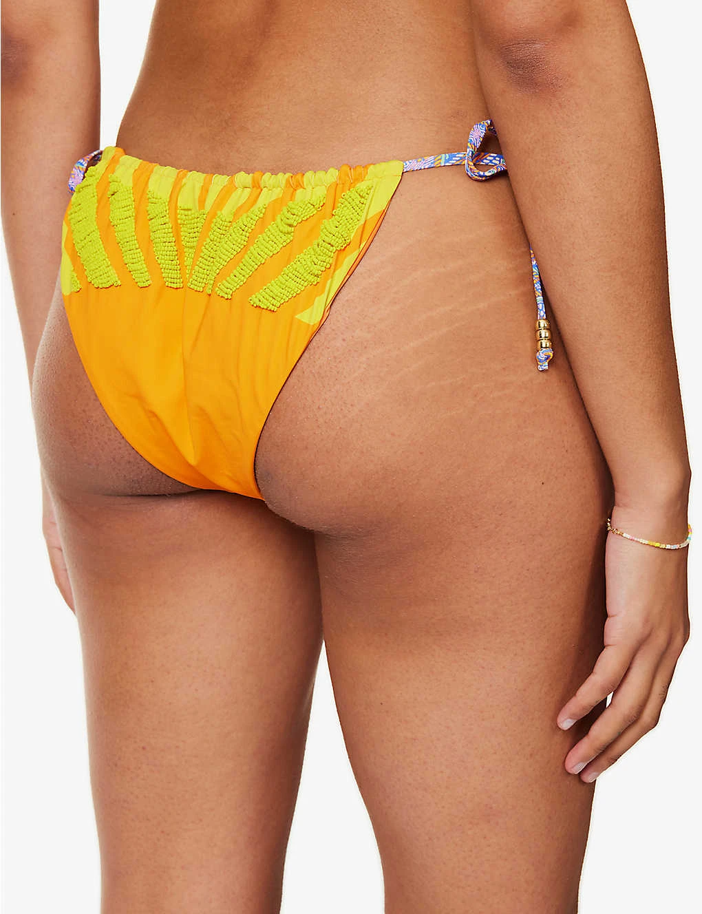- Mid-rise, elasticated waistband, adjustable laces at sides, gold-toned plaques, beds embellishment at front and back, fully lined, medium coverage at back