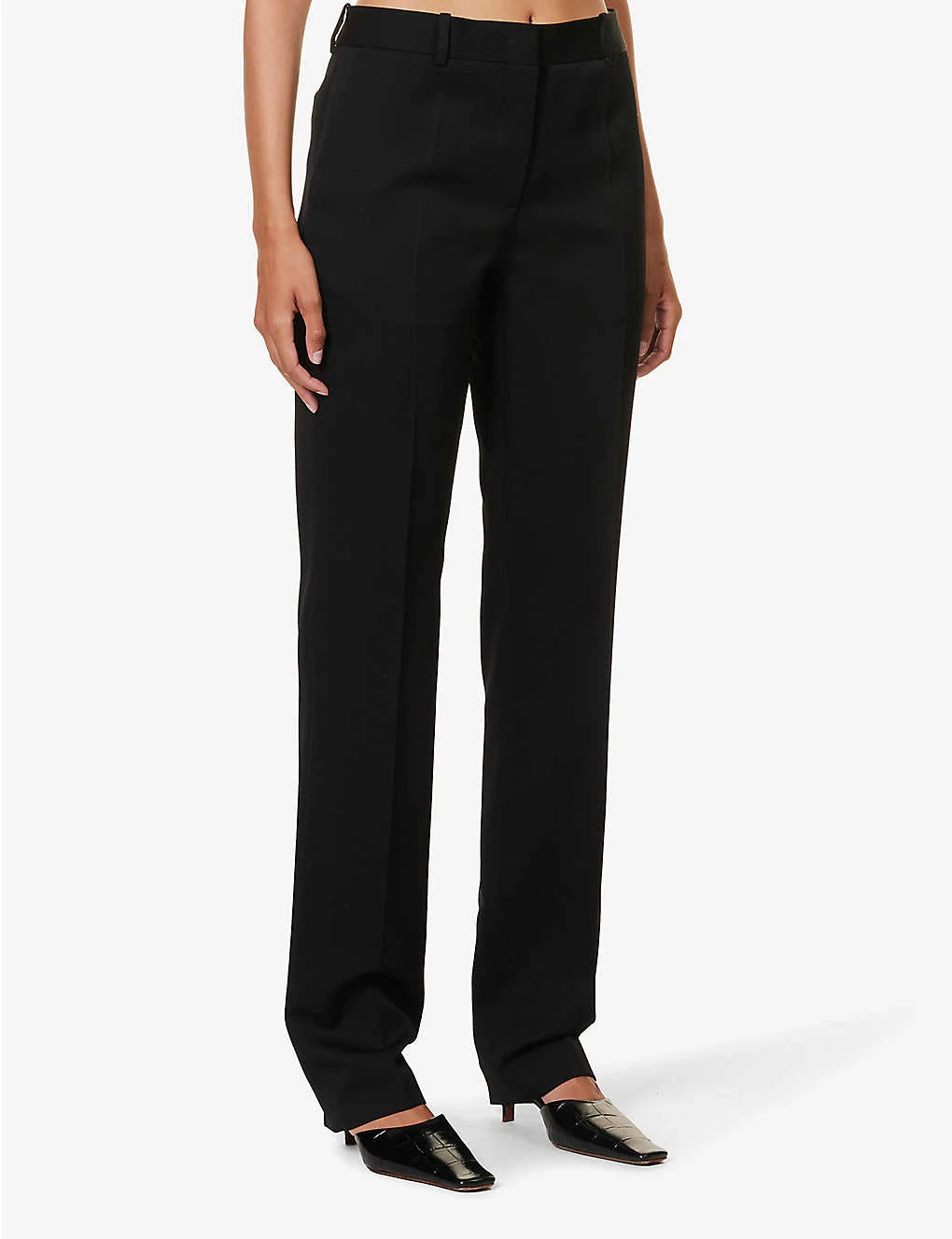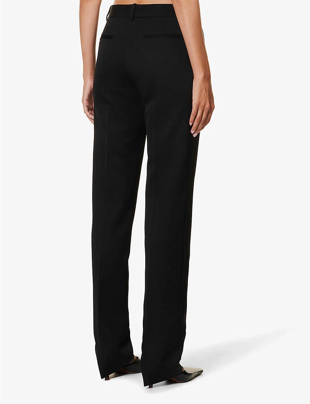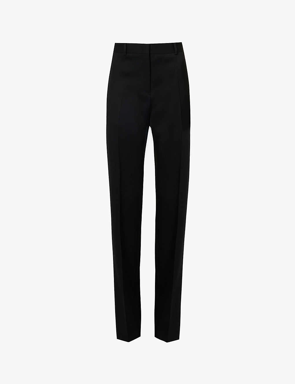 - Regular fit, high-rise, straight leg, two slip pockets at front, two jetted pockets at back, pressed centre creases