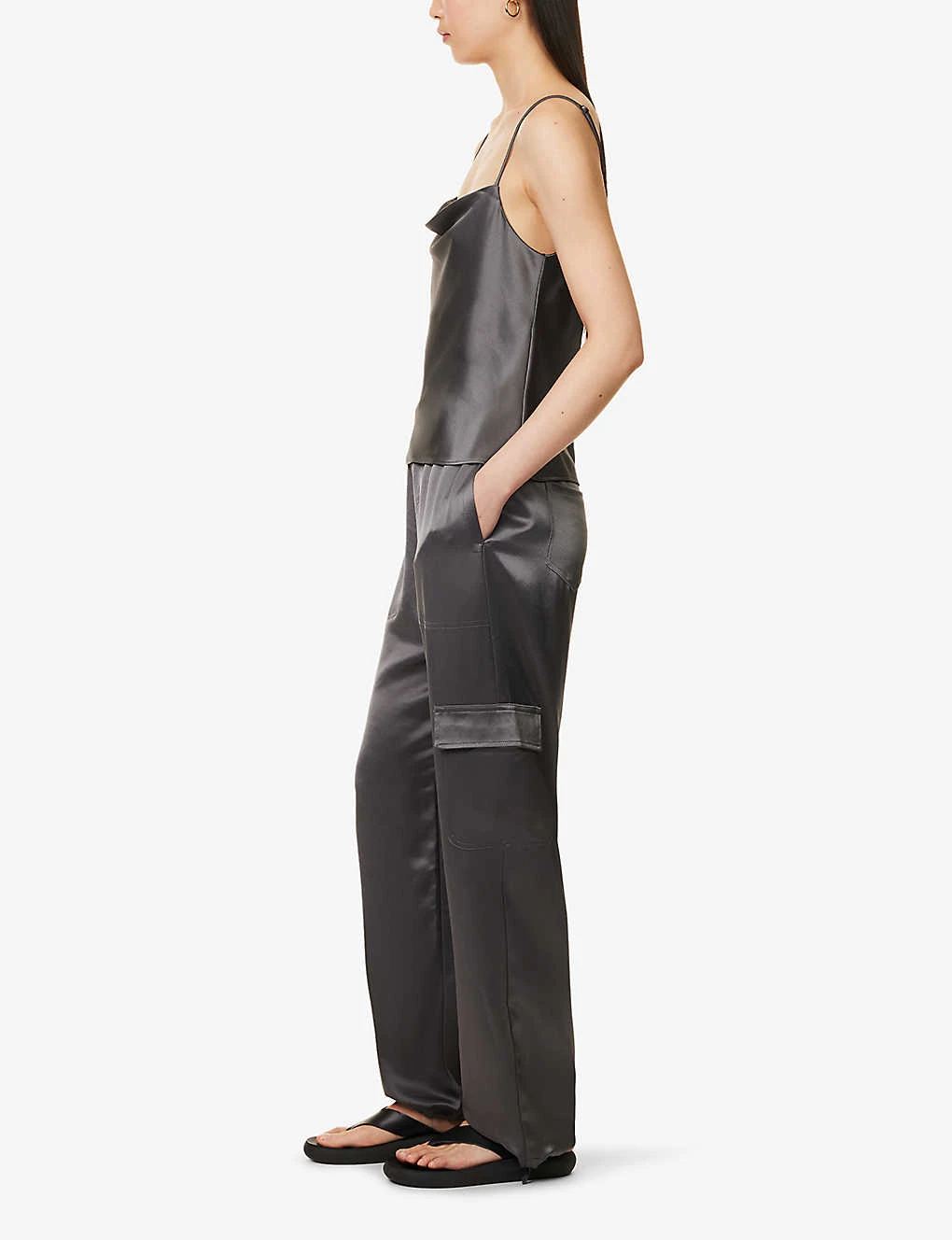 - Relaxed fit, high rise, elasticated drawstring waistband, two slip pockets at sides, two flap pockets at legs, two patch pockets at back, satin finish