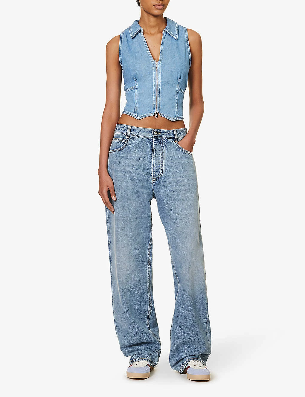 - Slim fit, V neck, spread collar, sleeveless, two pockets at front, brand tab at side, straight yoke at back, faded wash, asymmetric hem