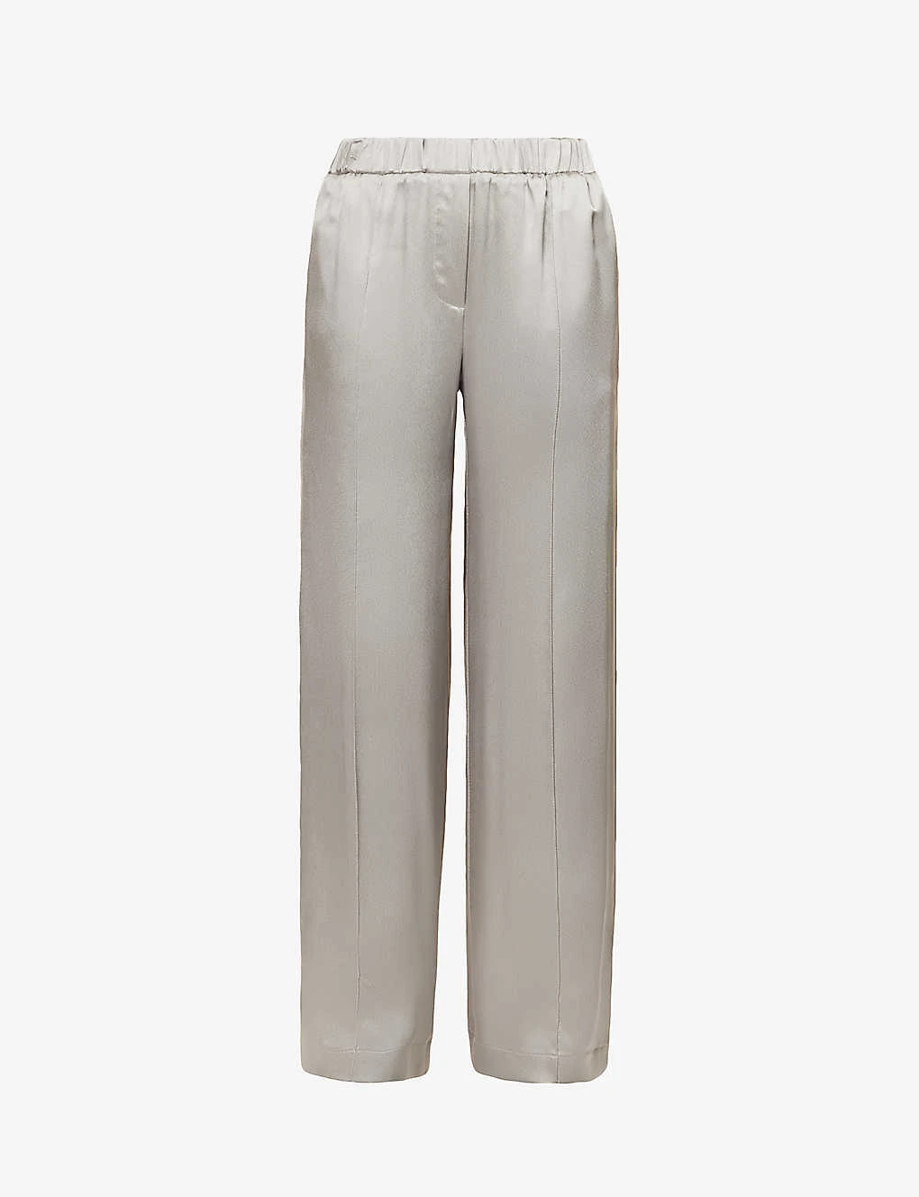 - Regular fit, mid-rise, wide leg, elasticated waistband, two slip pockets at front, tonal brand embroidery at back, welt pocket at back, satin texture