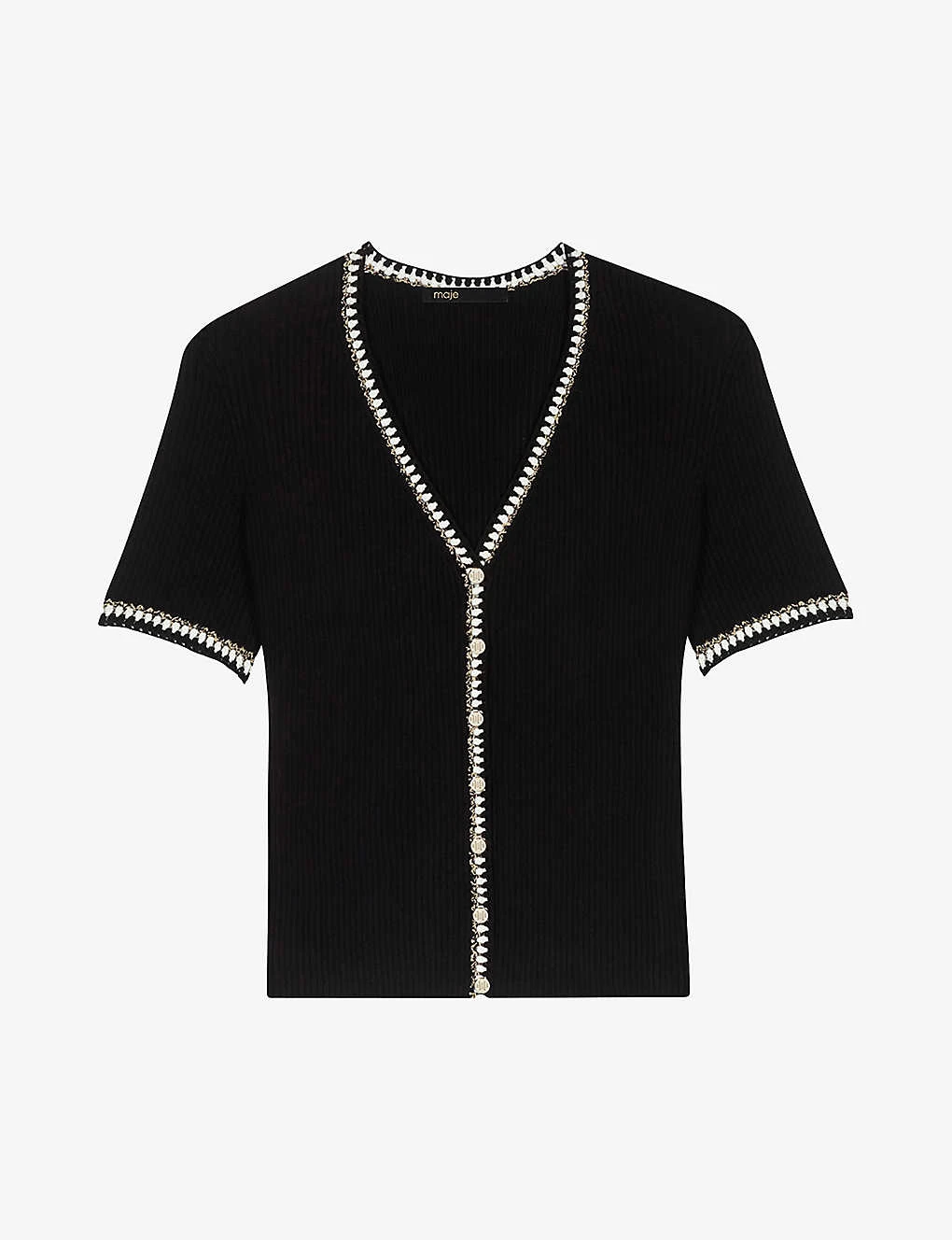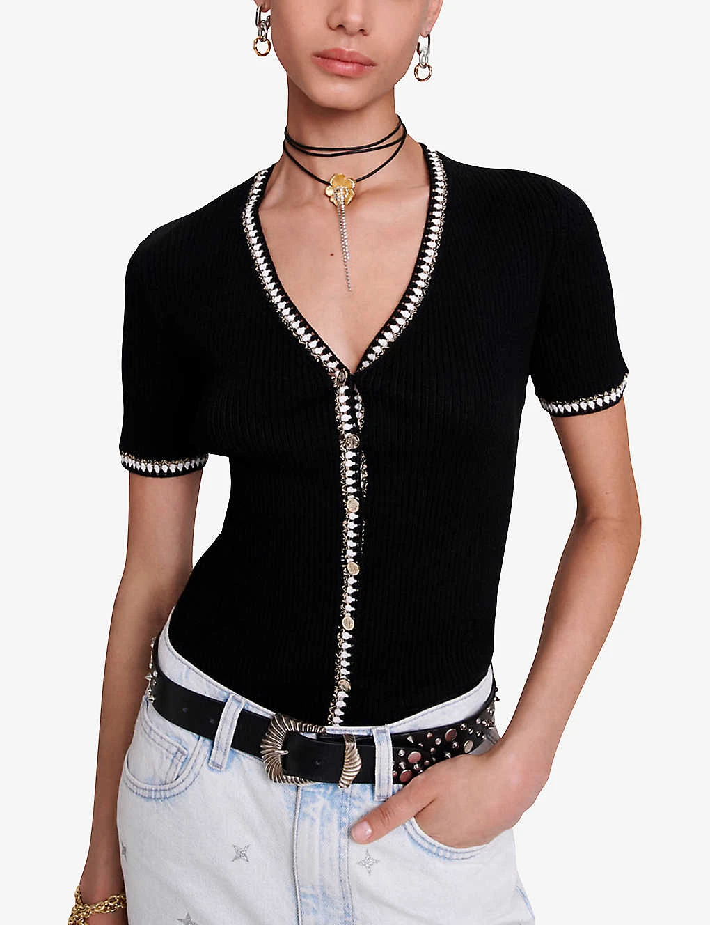 - Fitted, V-neckline, short sleeves, all-over contrast crochet-knit trim, exposed buttons at front, god-tone hardware