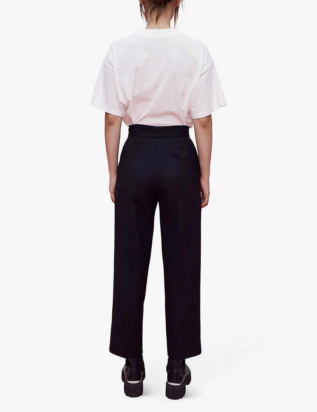 - Straight leg, cropped length, high rise, pinstriped pattern, belt loops, side slip pockets, front button and zip fly fastening, fully lined