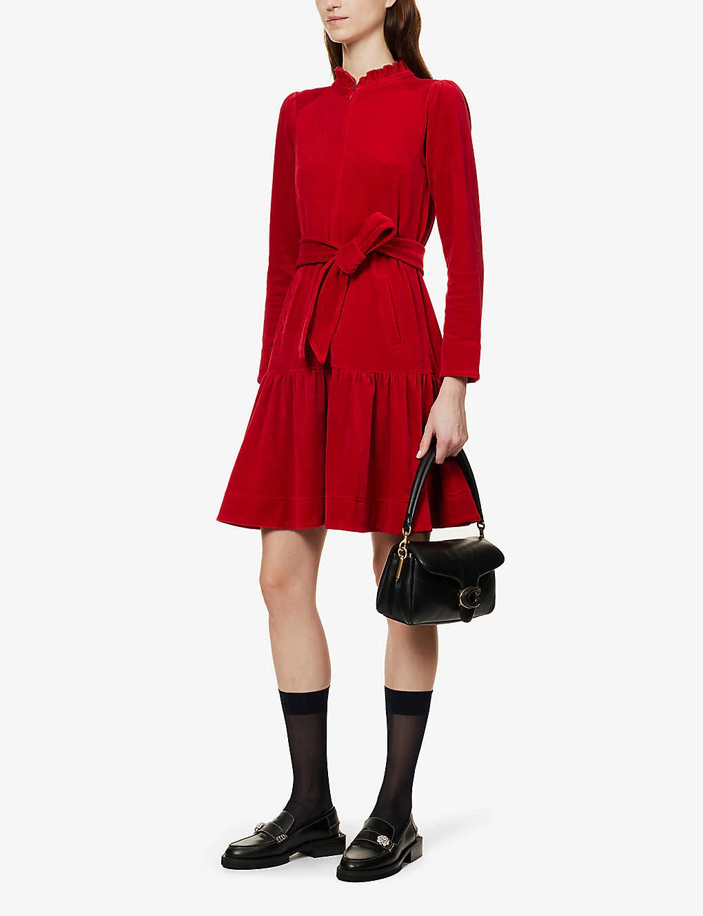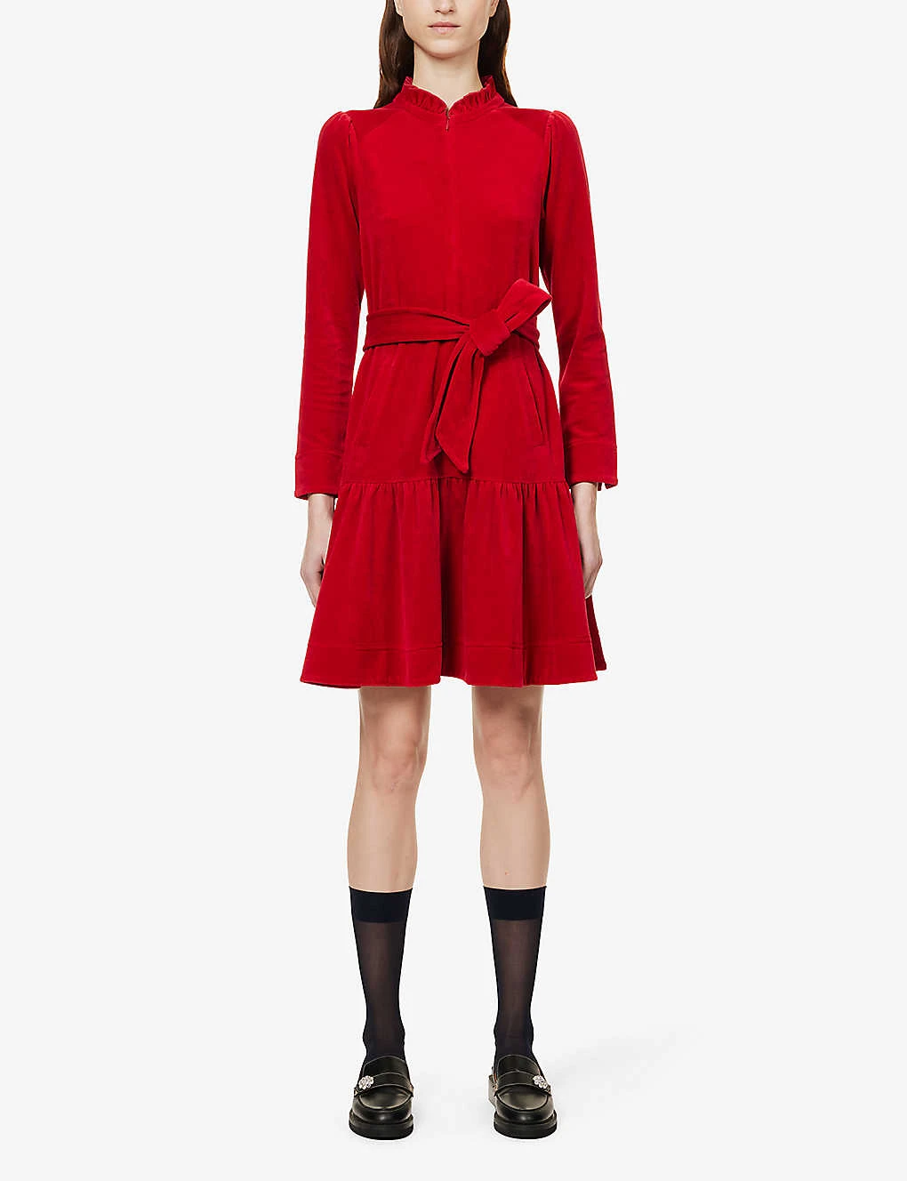 - Regular fit, round neck, long sleeves, two slip pockets at front, detachable self-tie, tiered hem, all-over velvet texture