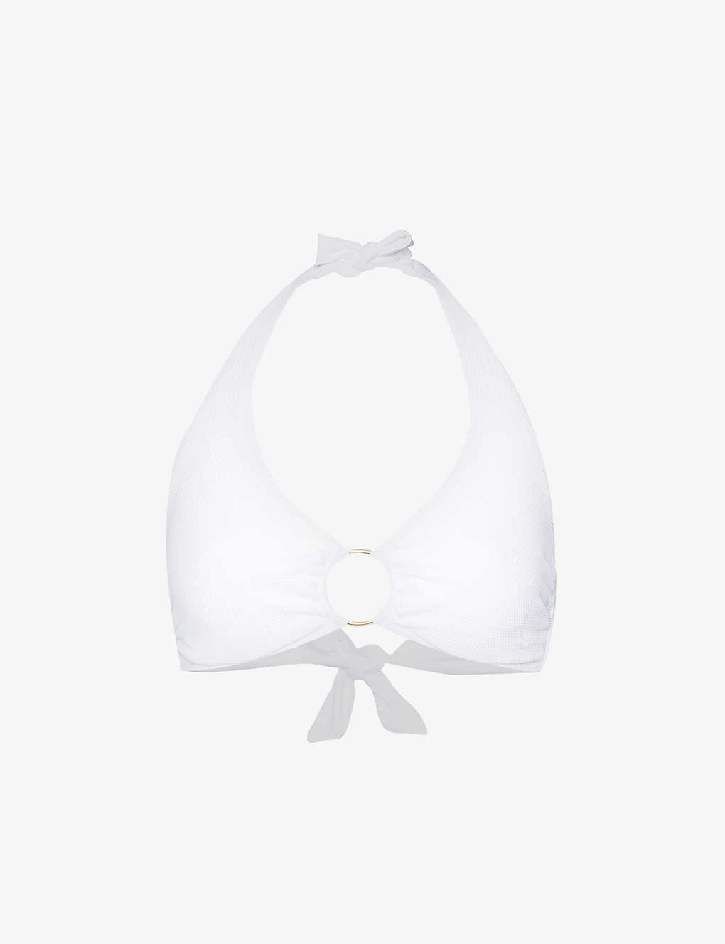 - Regular-fit, V-neck, halterneck, ring-loop at chest, gold-toned hardware, open back