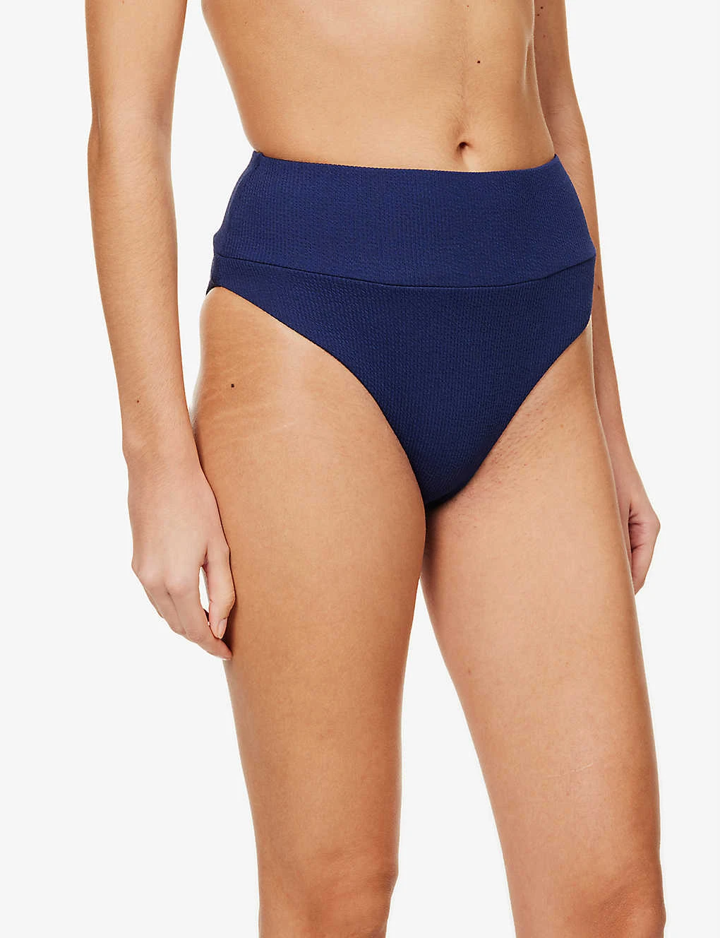 - High-rise, elasticated waistband, folded trim at waist, all-over textured weave, full-coverage at back, fully lined