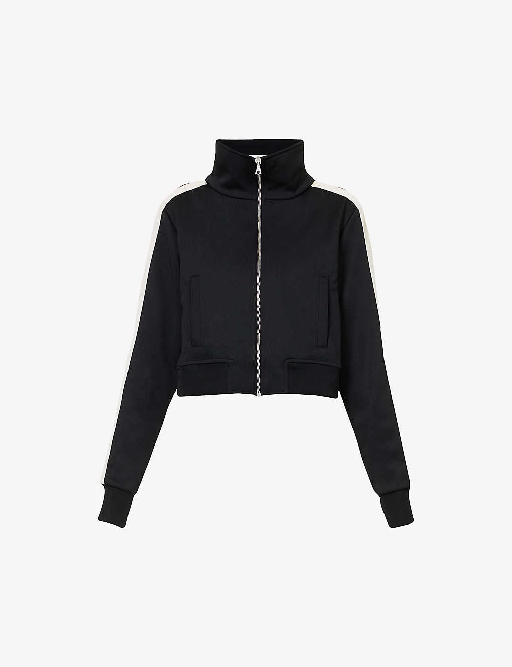 - Regular fit, high neck, long sleeves, contrast stripe trims at sleeves, two slip pockets at front, ribbed trims, branded silver-toned hardware