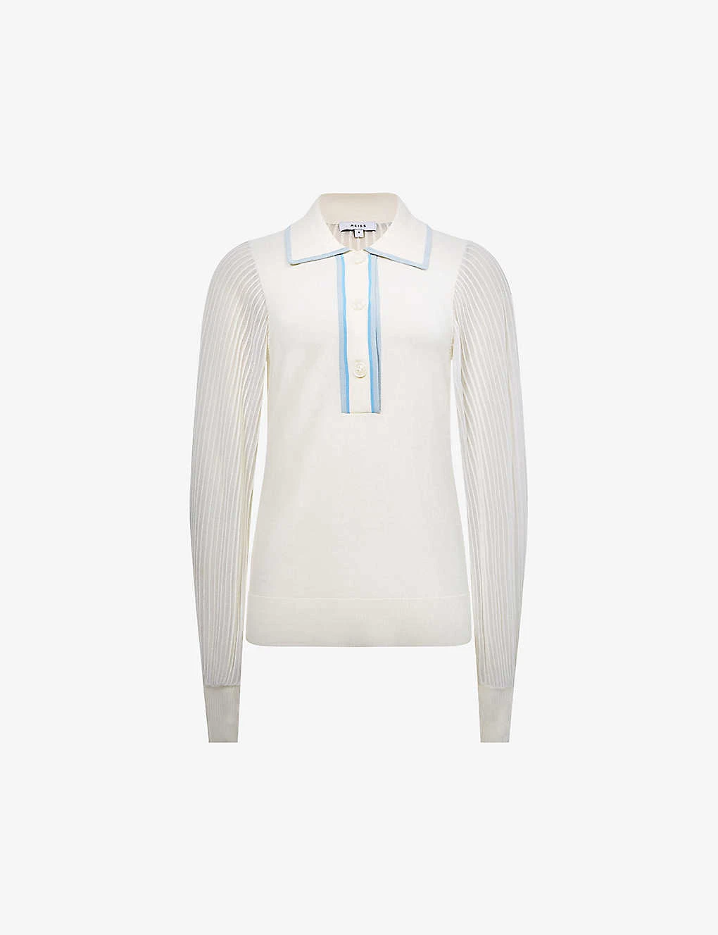 - Relaxed fit, oversized collar, contrasting trim around collar and button placket, long sleeves, sheer balloon sleeves, ribbed trims