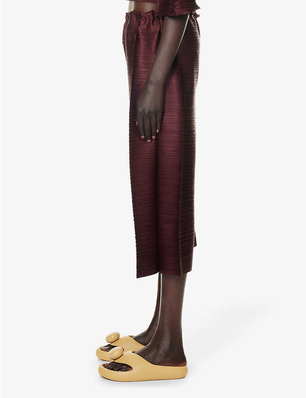 - Regular fit, mid-rise, wide cropped leg, elasticated waistband, two slip pockets at front, all-over textured pleat design