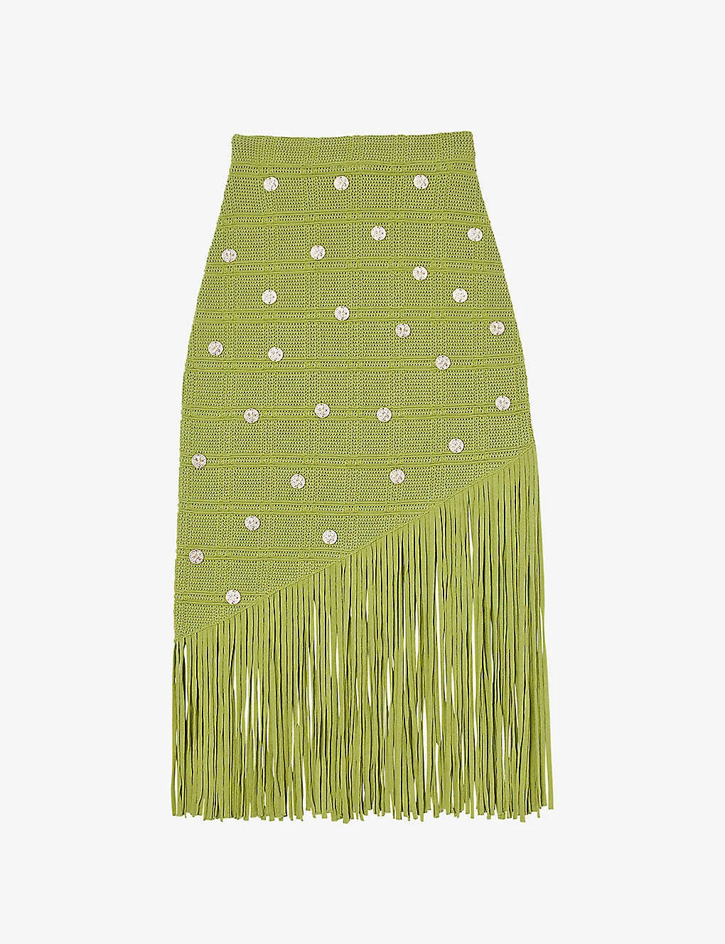 - Fitted, elasticated waist, all-over openwork crochet fabrication, all-over embellished sequins, fringe-embellished hem