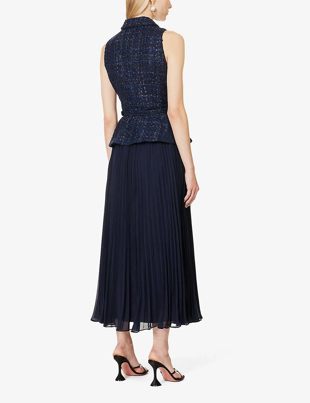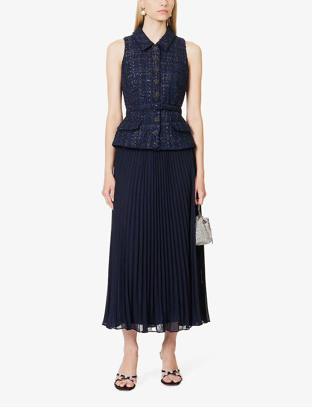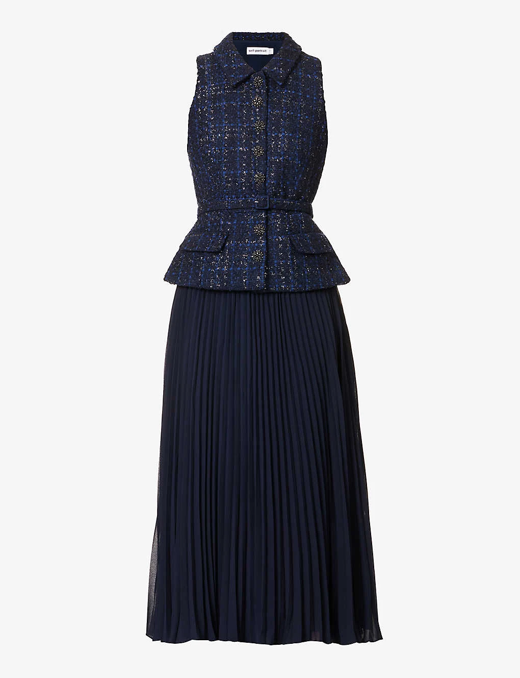 - Regular fit, collar, sleeveless, darts at front, two flap pockets at front, bouclé textured bodice, contrast pleated flared hem