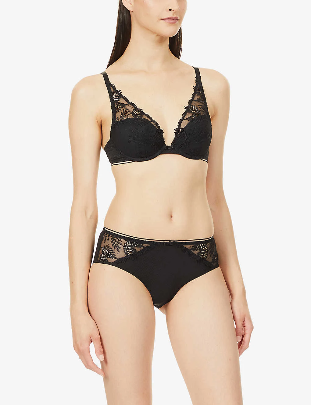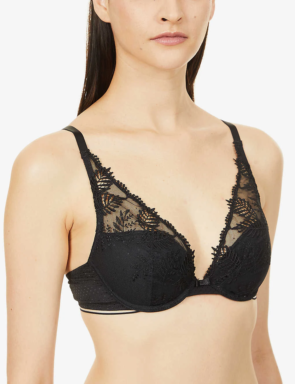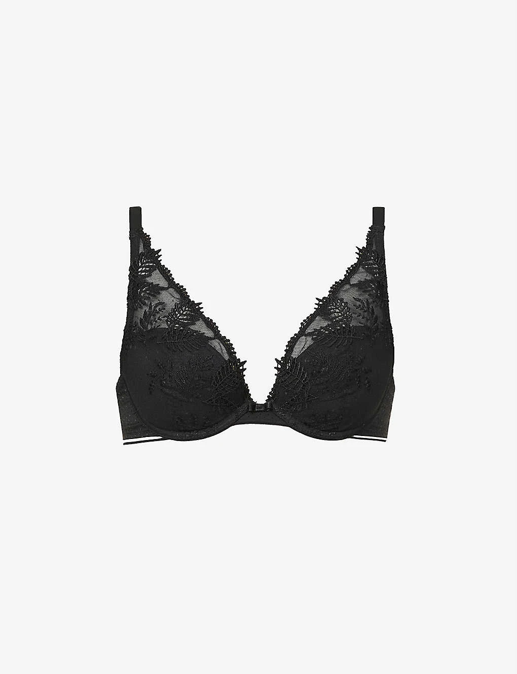 - Plunging V-neck, adjustable straps, underwiring, detachable padding, semi-sheer panels, all-over lace embroidery, fully lined