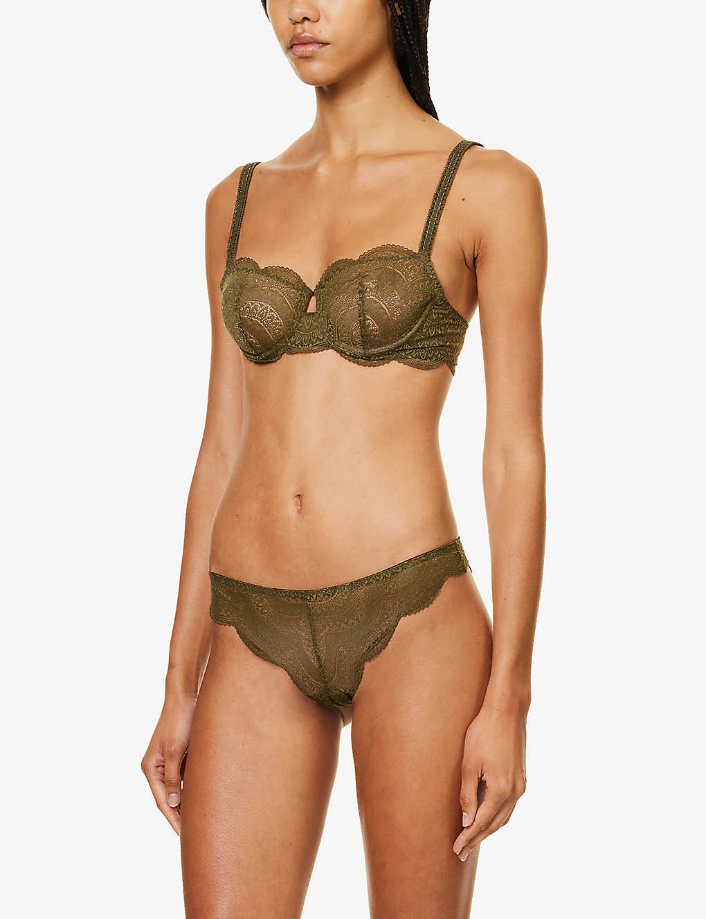 Sweetheart neckline, adjustable shoulder straps, underwired, semi-sheer, scalloped hems
