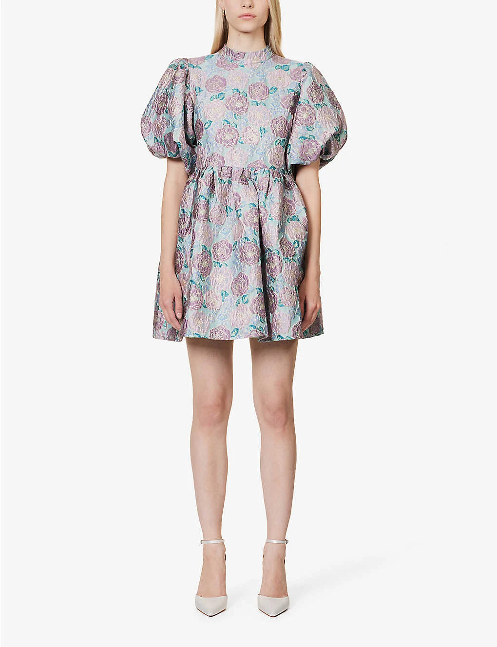 - Relaxed fit, round neck, puffed short shoulders, elasticated cuffs, cut-out at back, all over flower print, all over metallic weave embellishment, textured, pleated skirt, fully lined, flared hem