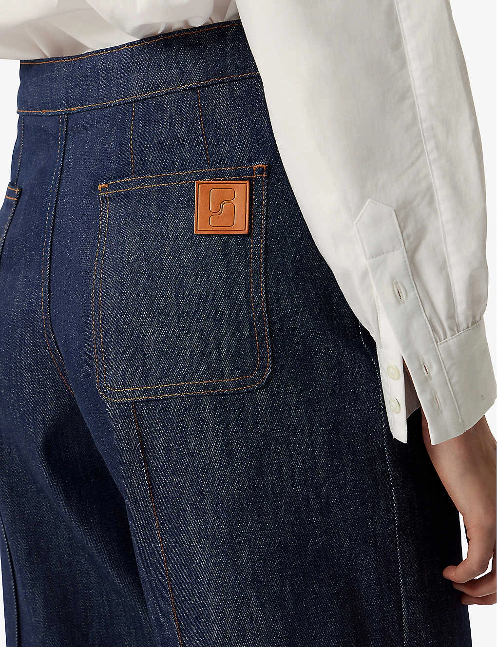 - Regular-fit, high-rise, wide leg, belt loops, darts at front and back, two patch pockets at front and back, washed