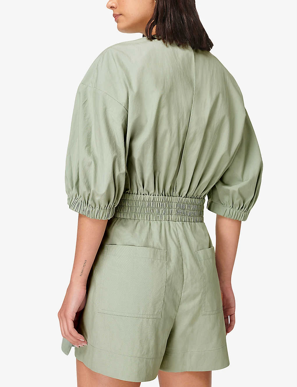 - Round neck, three-quarter length blouson sleeves, dropped shoulders, gathered waist, elasticated waistband, elasticated cuffs, peephole detail to the back, two patch pockets to the back, shorts with split side hems