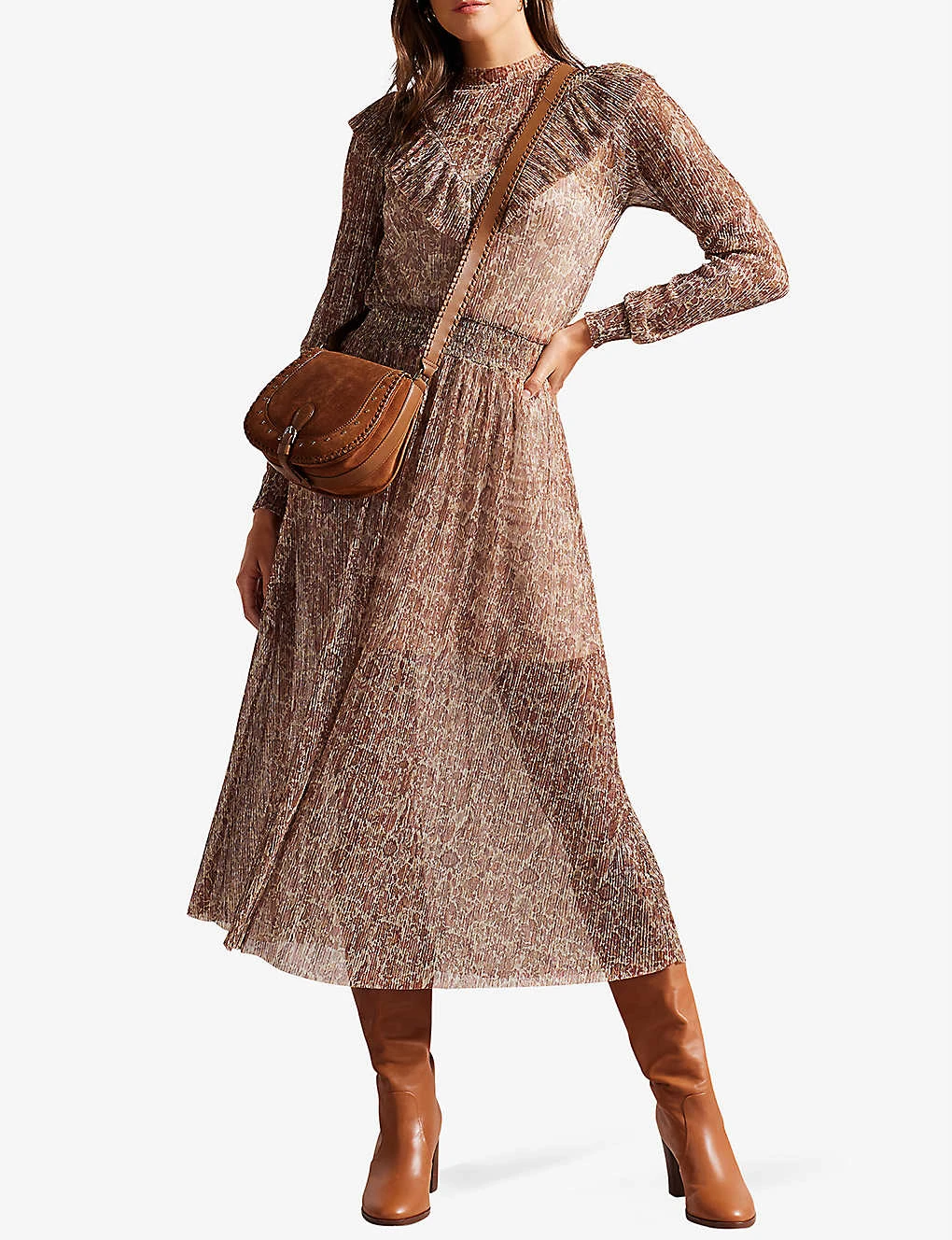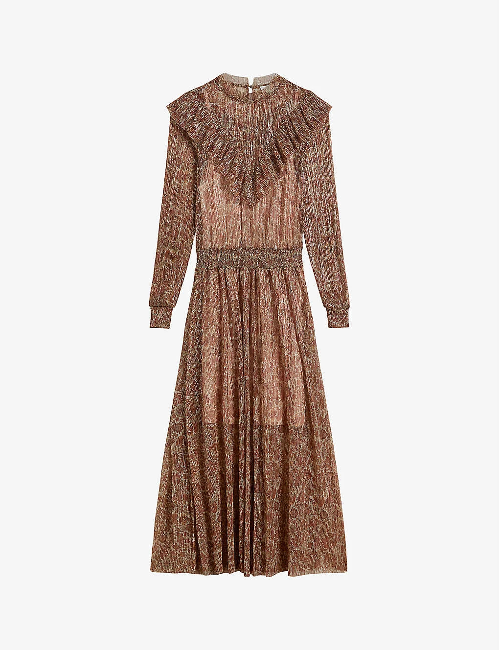 - Boat neck, long sleeves, all-over floral print, all-over metallic weave, frilled trim to the yoke, smocked waist, pleated skirt, midi length