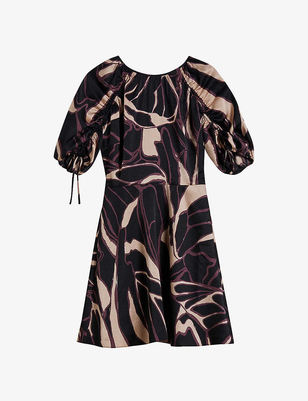 - Mini length, round neck, short puffed sleeves, all-over abstract print, ruching at sleeves, tied cuffs, flared skirt, tie fastening at back, fully lined