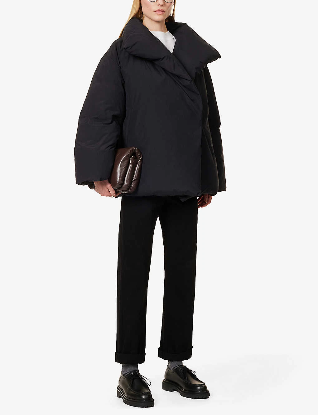 - Oversized fit, funnel neck, dropped shoulders, long sleeves, two angled slip pockets at front, padded