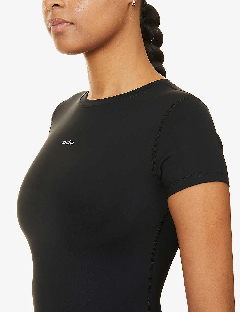 - Slim fit, round neckline, short sleeves, contrast brand text print at front, tonal thread-overlock stitching
