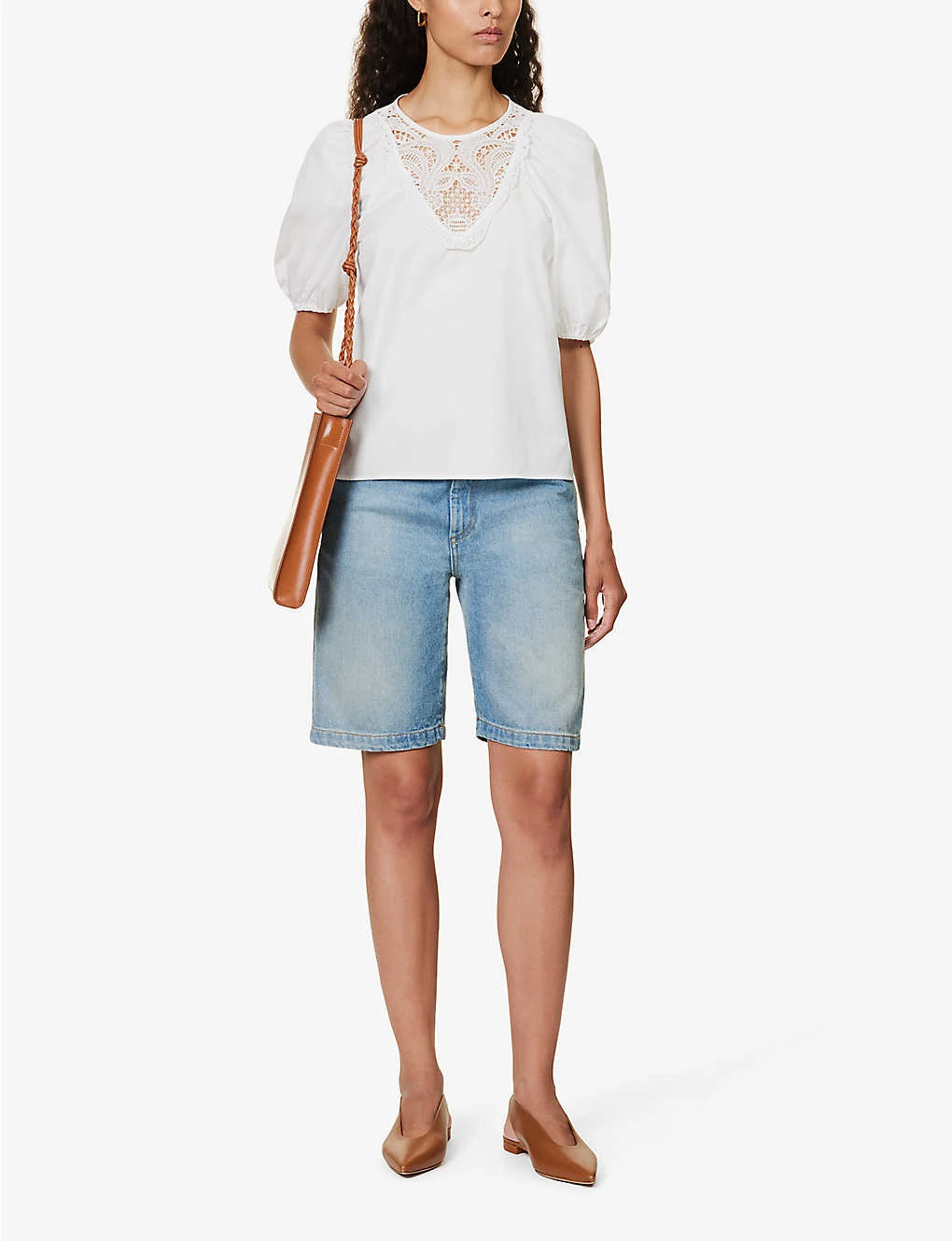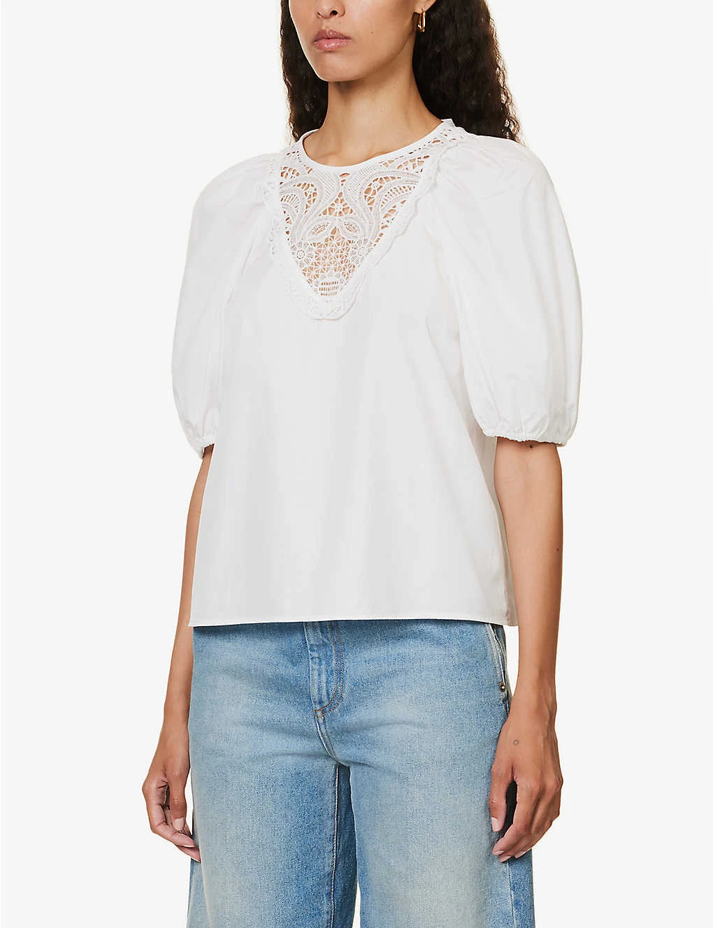 - Relaxed fit, round neck, short puff sleeves, semi-sheer lace panel at chest, pearlescent buttons