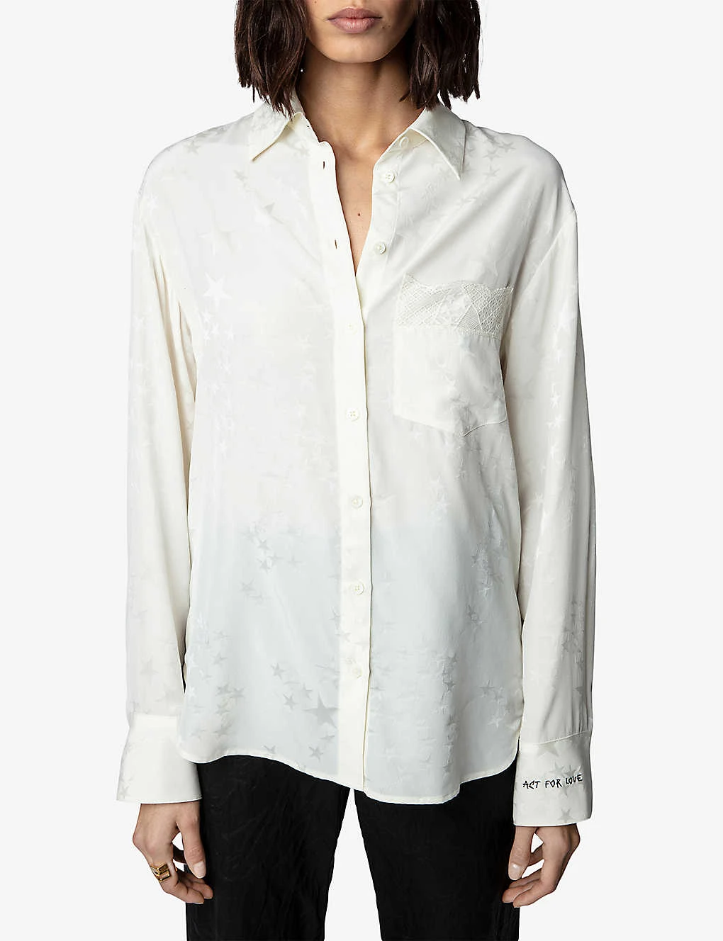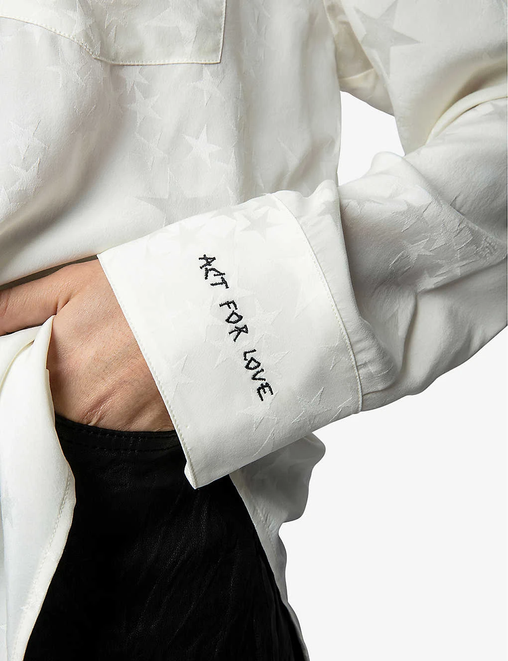 - Collar, long sleeves, ‘act of love’ embroidery at cuff, buttoned cuffs, all-over star jacquard, lace-trimmed patch pocket at chest, stepped hem